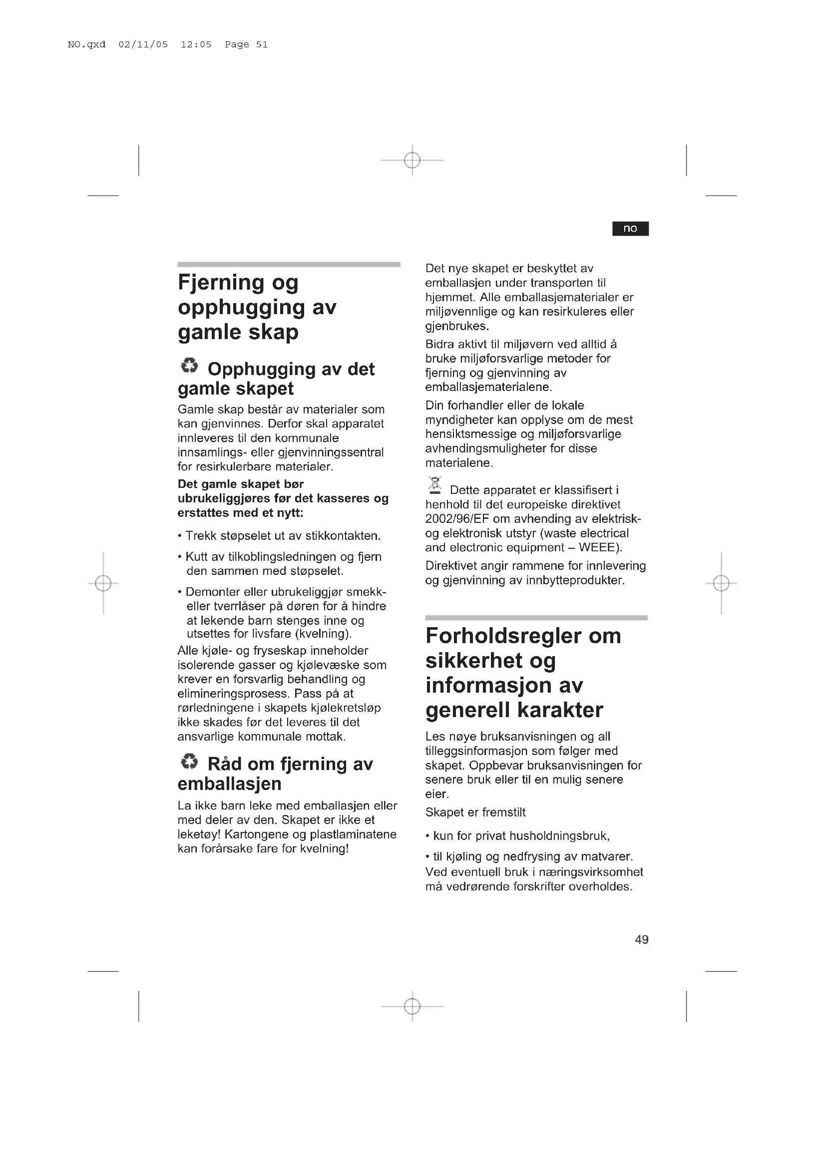 - Demonter eller ubrukeliggjør smekk- eller tverrlåser på døren for å hindre at lekende barn stenges inne og utsettes for livsfare (kvelning). Alle kjøle- og fryseskap inneholder isolerende gasser og kjølevæske som krever en forsvarlig behandling og elimineringsprosess. Pass på at rørledningene i skapets kjølekretsløp ikke skades før det leveres til det ansvarlige kommunale mottak. Råd om fjerning av emballasjen La ikke barn leke med emballasjen eller med deler av den. Skapet er ikke et leketøy! Kartongene og plastlaminatene kan forårsake fare for kvelning! Det nye skapet er beskyttet av emballasjen under transporten til hjemmet. Alle emballasjematerialer er miljøvennlige og kan resirkuleres eller gjenbrukes. Bidra aktivt til miljøvern ved alltid å bruke miljøforsvarlige metoder for fjerning og gjenvinning av emballasjematerialene. Din forhandler eller de lokale myndigheter kan opplyse om de mest hensiktsmessige og miljøforsvarlige avhendingsmuligheter for disse materialene. Dette apparatet er klassifisert i henhold til det europeiske direktivet 2002/96/EF om avhending av elektrisk- og elektronisk utstyr (waste electrical and electronic equipment – WEEE). Direktivet angir rammene for innlevering og gjenvinning av innbytteprodukter. Forholdsregler om sikkerhet og informasjon av generell karakter Les nøye bruksanvisningen og all tilleggsinformasjon som følger med skapet. Oppbevar bruksanvisningen for senere bruk eller til en mulig senere eier. Skapet er fremstilt