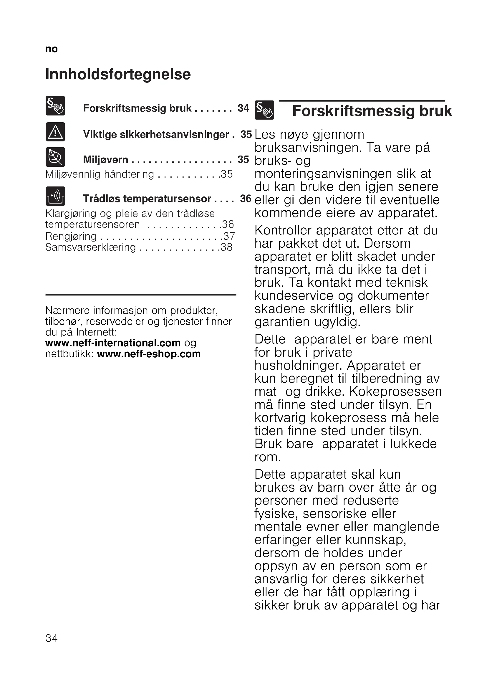 - Innholdsfortegnelse noBruksveiledning 8 Forskriftsmessig bruk p. 34