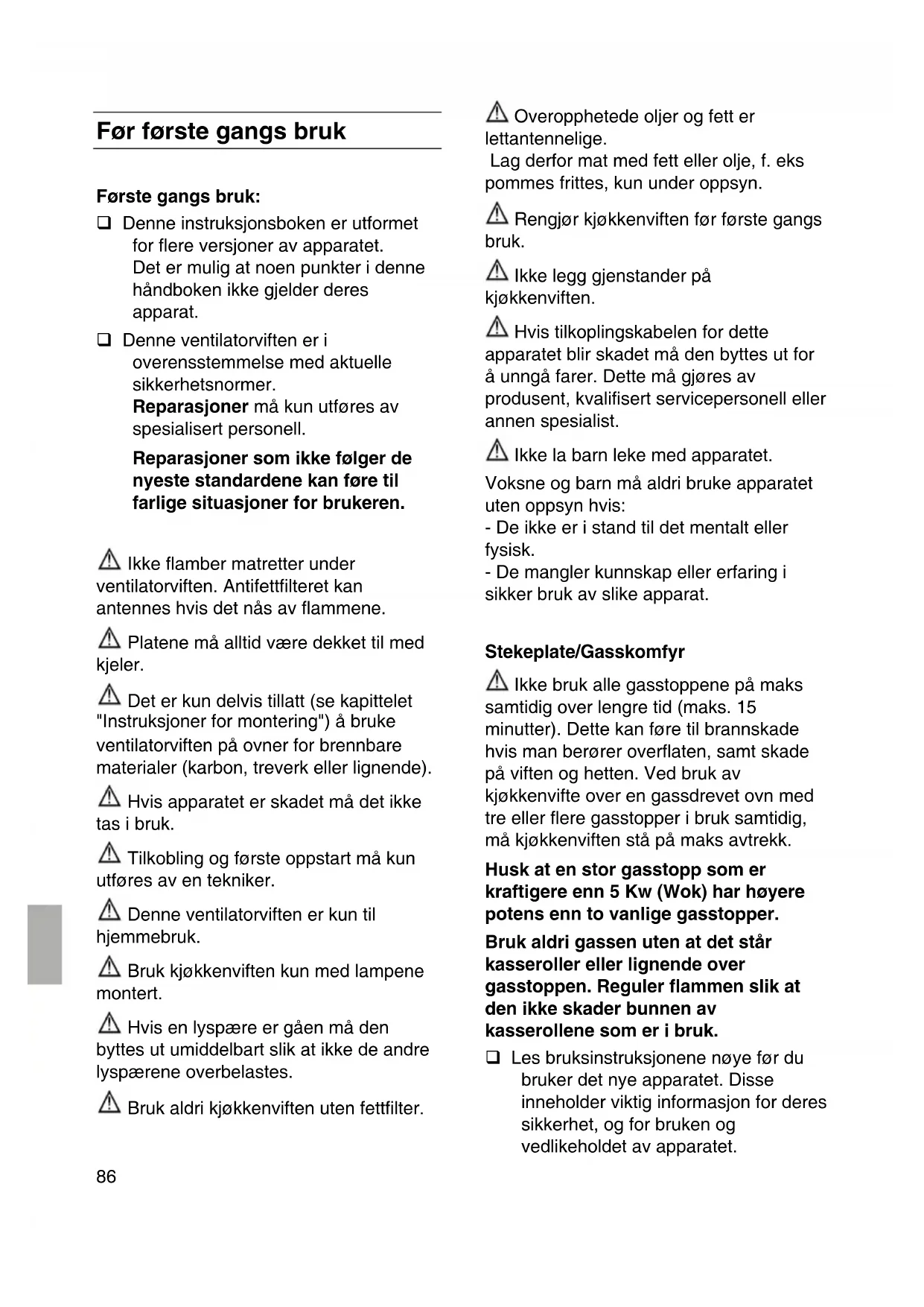 Før første gangs bruk Første gangs bruk: Denne instruksjonsboken er utformet for flere versjoner av apparatet. Det er mulig at noen punkter i denne håndboken ikke gjelder deres apparat. Denne ventilatorviften er i overensstemmelse med aktuelle sikkerhetsnormer. Reparasjoner må kun utføres av spesialisert personell. Reparasjoner som ikke følger de nyeste standardene kan føre til farlige situasjoner for brukeren. Ikke flamber matretter under ventilatorviften. Antifettfilteret kan antennes hvis det nås av flammene. Platene må alltid være dekket til med kjeler. Det er kun delvis tillatt (se kapittelet "Instruksjoner for montering") å bruke ventilatorviften på ovner for brennbare materialer (karbon, treverk eller lignende). Hvis apparatet er skadet må det ikke tas i bruk. Tilkobling og første oppstart må kun utføres av en tekniker. Denne ventilatorviften er kun til hjemmebruk. Bruk kjøkkenviften kun med lampene montert. Hvis en lyspære er gåen må den byttes ut umiddelbart slik at ikke de andre lyspærene overbelastes. Bruk aldri kjøkkenviften uten fettfilter. Overopphetede oljer og fett er lettantennelige. Lag derfor mat med fett eller olje, f. eks pommes frittes, kun under oppsyn. Rengjør kjøkkenviften før første gangs bruk. Ikke legg gjenstander på kjøkkenviften. Hvis tilkoplingskabelen for dette apparatet blir skadet må den byttes ut for å unngå farer. Dette må gjøres av produsent, kvalifisert servicepersonell eller annen spesialist. Ikke la barn leke med apparatet. Voksne og barn må aldri bruke apparatet uten oppsyn hvis: - De ikke er i stand til det mentalt eller fysisk. - De mangler kunnskap eller erfaring i sikker bruk av slike apparat. Stekeplate/Gasskomfyr Ikke bruk alle gasstoppene på maks samtidig over lengre tid (maks. 15 minutter). Dette kan føre til brannskade hvis man berører overflaten, samt skade på viften og hetten. Ved bruk av kjøkkenvifte over en gassdrevet ovn med tre eller flere gasstopper i bruk samtidig, må kjøkkenviften stå på maks avtrekk. Husk at en stor gasstopp som er kraftigere enn 5 Kw (Wok) har høyere potens enn to vanlige gasstopper. Bruk aldri gassen uten at det står kasseroller eller lignende over gasstoppen. Reguler flammen slik at den ikke skader bunnen av kasserollene som er i bruk. Les bruksinstruksjonene nøye før du bruker det nye apparatet. Disse inneholder viktig informasjon for deres sikkerhet, og for bruken og vedlikeholdet av apparatet.87