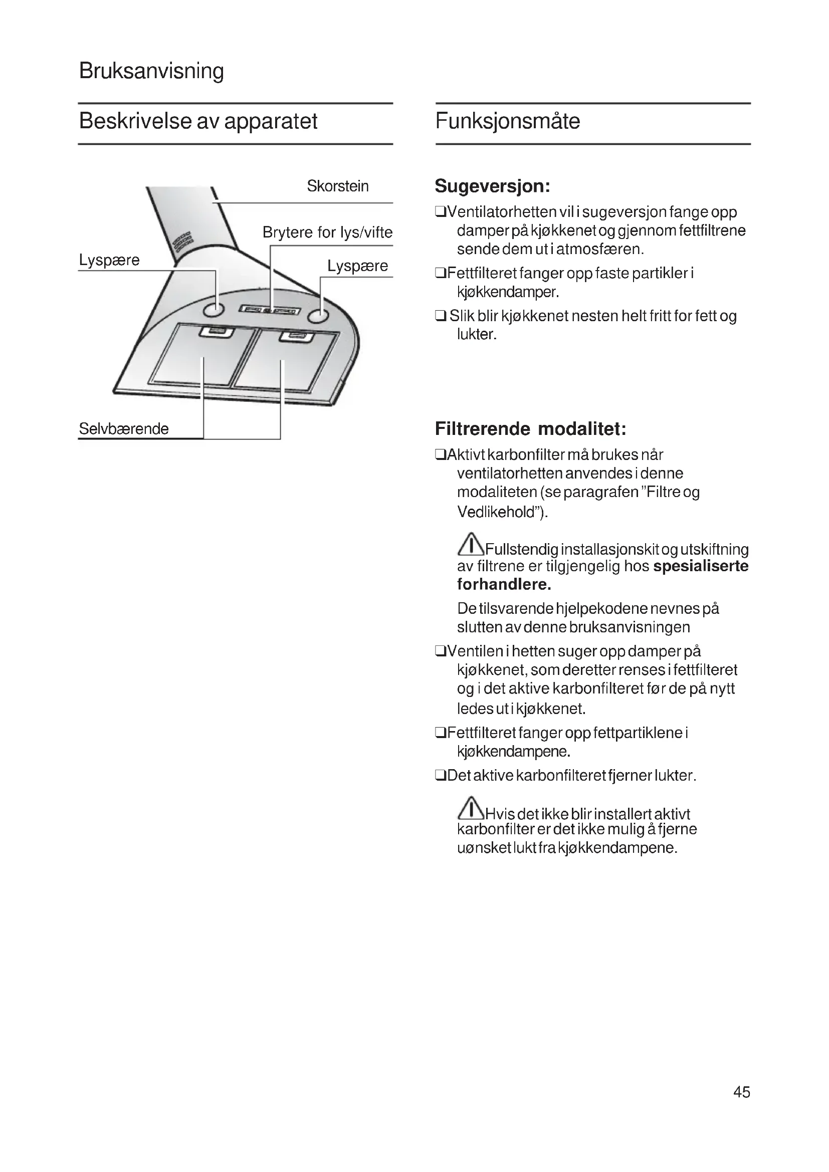 strömmen på elskåpet. Om ett problem uppstår Om du har frågor eller vid funktionsfel, var god kontakta kundservice. (Se listan över kundservicerepresentanter). Uppge följande uppgifter när du kontaktar kundservice: E-Nr. FD Fyll i respektive nummer i fältet ovan. Nr.- E (produktnr.) och FD (tillverkningsdatum) anges på märkplåten som sitter på köksfläktens insida och är synlig efter att filtergallret har tagits ur.45 Bruksanvisning Funksjonsmåte Sugeversjon: ❑ Ventilatorhetten vil i sugeversjon fange opp damper på kjøkkenet og gjennom fettfiltrene sende dem ut i atmosfæren. ❑ Fettfilteret fanger opp faste partikler i kjøkkendamper. ❑ Slik blir kjøkkenet nesten helt fritt for fett og lukter. Filtrerende modalitet: ❑ Aktivt karbonfilter må brukes når ventilatorhetten anvendes i denne modaliteten (se paragrafen ”Filtre og Vedlikehold”). Fullstendig installasjonskit og utskiftning av filtrene er tilgjengelig hos spesialiserte forhandlere. De tilsvarende hjelpekodene nevnes på slutten av denne bruksanvisningen ❑ Ventilen i hetten suger opp damper på kjøkkenet, som deretter renses i fettfilteret og i det aktive karbonfilteret før de på nytt ledes ut i kjøkkenet. ❑ Fettfilteret fanger opp fettpartiklene i kjøkkendampene. ❑ Det aktive karbonfilteret fjerner lukter. Hvis det ikke blir installert aktivt karbonfilter er det ikke mulig å fjerne uønsket lukt fra kjøkkendampene. Skorstein Brytere for lys/vifte Lyspære Lyspære Selvbærende Beskrivelse av apparatet46 Før du bruker apparatet første gang Viktige merknader: ❑ Bruksanvisningene er gyldige for diverse versjoner av dette apparatet. Derfor er det mulig at du kan finne beskrivelser av enkelte karakteristikker som ikke henviser til akkurat ditt apparat. ❑ Denne ventilatorhetten er laget i samsvar med alle de mest relevante sikkerhetsnormer Eventuelle reparasjoner må kun utføres av teknisk kvalifisert personale. Uforsvarlige reparasjoner kan forårsake stor risiko for brukeren. ❑ Før man bruker apparatet første gang må man lese disse bruksanvisningene nøye. De inneholder viktig informasjon både om egen personlig sikkerhet og om bruk og vedlikehold av apparatet. ❑ Vi ber deg vennligst om å oppbevare bruksanvisningen og installasjonsveiledningene for en eventuell senere eier. Sørg for forsvarlig avskaffelse av emballasjematerialene (se Installasjonsveiledning). Denne ventilatorhetten er prosjektert kun for husholdningsbruk. Før rengjøring eller vedlikehold av apparatet må ventilatoren kobles fra elnetttet ved å trekke ut støpselet eller skru ut sikringen i husets sikringsskap. Ventilatoren er ikke egnet til å brukes av barn eller personer med nedsatte fysiske, mentale eller sensoriske funksjoner, eller med manglende erfaring og kjennskap, med mindre disse ikke blir overvåket eller gitt instruksjoner om bruk av apparatet av en person som står ansvarlig for deres sikkerhet. Barn må overvåkes for å kontrollere at de ikke leker med apparatet. Ventilatoren må aldri brukes uten at gitteret er korrekt montert! Ventilatoren må ALDRI brukes som anleggsflate, med mindre det er uttrykkelig angitt. Rommet må være godt ventilert når ventilatoren brukes samtidig med andre apparater som bruker gassforbrenning eller andre brennstoffer. Luften som suges opp må ikke føres ut i en avtrekkskanal for røyk som produseres av apparater som bruker gassforbrenning eller andre brennstoffer. Det er strengt forbudt å lage mat på åpen ild under ventilatorhetten. Bruk av åpen ild skader filtrene og kan fremkalle brann, derfor må det absolutt unngås. Steking må foregå under kontroll for å unngå at den overopphetede oljen tar fyr. Når det gjelder de tekniske sikkerhetsforanstaltningene som må anvendes for røykutløp, må man forholde seg strengt til gjeldende lokale regelverk. Ventilatoren må rengjøres ofte både innvendig og utvendig (MINST EN GANG I MÅNEDEN; uansett må man følge instruksjonene som er uttrykkelig angitt i vedlikeholdsanvisningene i denne håndboken). Hvis man ikke overholder normene for rengjøring av ventilatoren og utskiftning og rengjøring av filtrene, vil dette medføre risiko for brann.47 Gasstopper og elektriske platetopper Ikke la alle brennerne på gasstoppen stå på samtidig på maksimal styrke i mer enn 15 minutter, ellers er det fare for at ventilatorens overflate overopphetes og dermed forårsaker forbrenninger når man rører ved den. Dessuten kan selve ventilatoren skades. Hvis man bruker mer enn 3 gassbrennere samtidig, skal man la ventilatoren gå på maksimal styrke. ❑ Bemerk: en stor gassbrenner med en styrke på over 5 KW (wok brenner) tilsvarer 2 standard gassbrennere. ❑ Gassbrennerne skal aldri stå på uten å være dekket av kjeler. Juster flammen slik at den ikke går utenfor kjelens omkrets. Ventilatoren må alltid ha korrekt monterte lyspærer, både under bruk og i stand by, for å unngå risikoen for elektrisk støt. Produsenten fraskriver seg ethvert ansvar for eventuelle uhell, skader eller brann på apparatet som skyldes at bruksanvisningen i denne håndboken ikke har blitt overholdt.48 Funksjonsprosedyre Den mest effektive metoden for å fjerne damper under matlaging er den følgende: ❑ Slå på ventilatorhetten med det samme du begynner å lage mat. ❑ Slå av ventilatorhetten noen minutter etter du er ferdig med å lage mat. Påslåing: ❑ Vri den høyre stilleren inntil ønsket hastighet. Avslåing: ❑ Vri den høyre stilleren tilbake inntil posisjon
