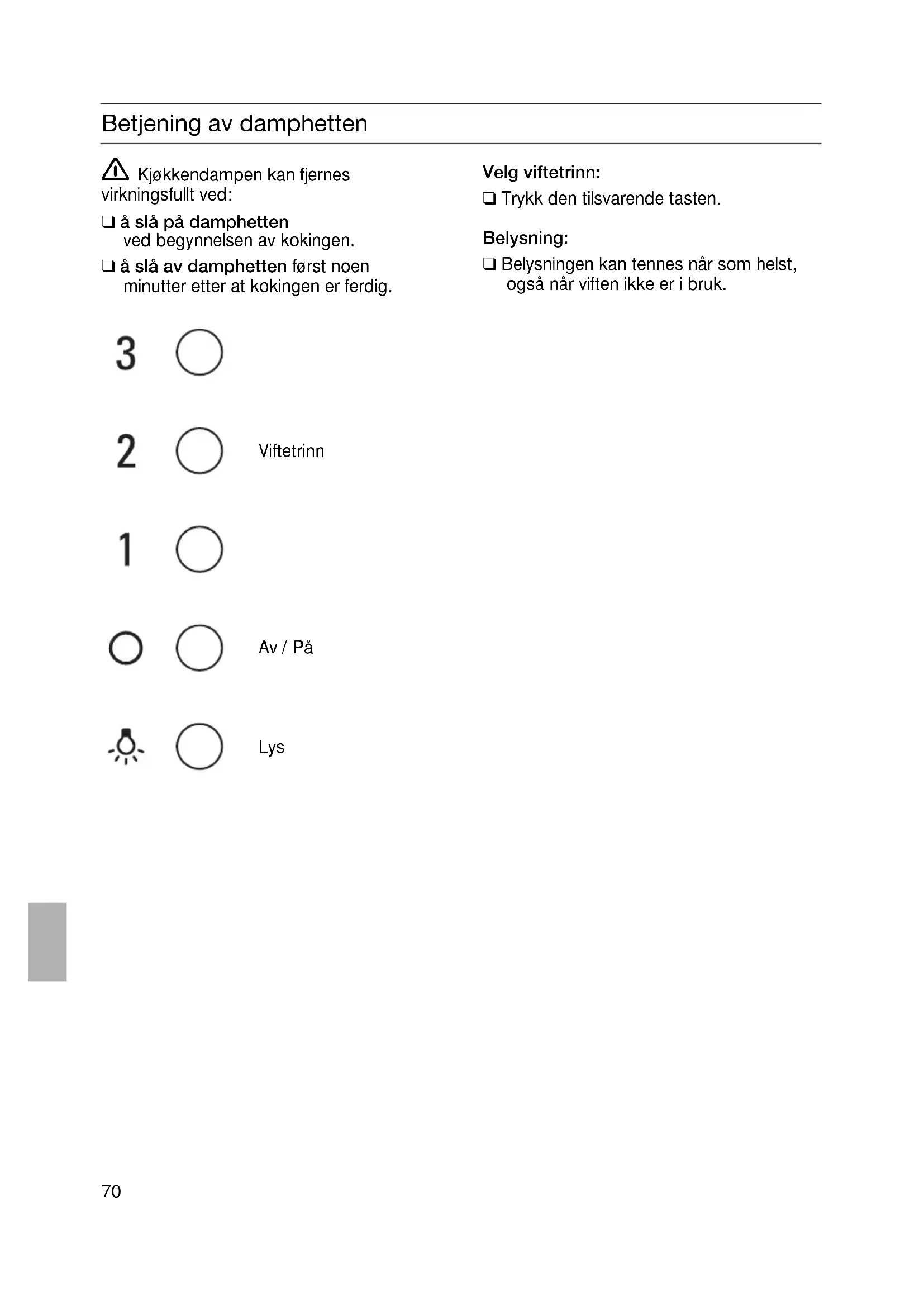 Betjening av damphetten Kjøkkendampen kan fjernes virkningsfullt ved: ❑ å slå på damphetten ved begynnelsen av kokingen. ❑ å slå av damphetten først noen minutter etter at kokingen er ferdig. Viftetrinn Velg viftetrinn: ❑ Trykk den tilsvarende tasten. Belysning: ❑ Belysningen kan tennes når som helst, også når viften ikke er i bruk. Lys Av / På71 Uttaking og innsetting av metall-fettfilter: Pass på: Halogenlampene må være slått av og må være avkjølte.