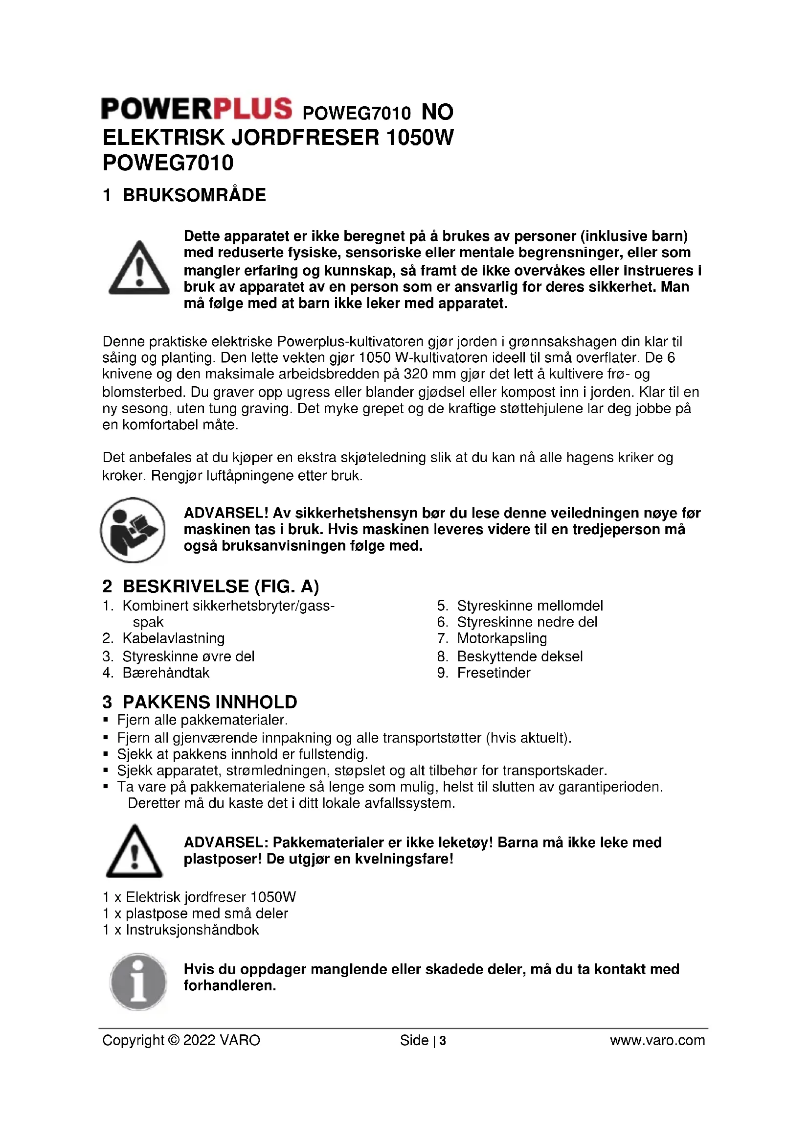 - Bruk egnede klær. Ikke bruk vide klær eller smykker. Hold hår, klær og hansker unna bevegelige deler. Løse klær, smykker eller langt hår kan henge seg opp i bevegelige deler.POWEG7010 NO Copyright © 2022 VARO Side | 6 www.varo.com