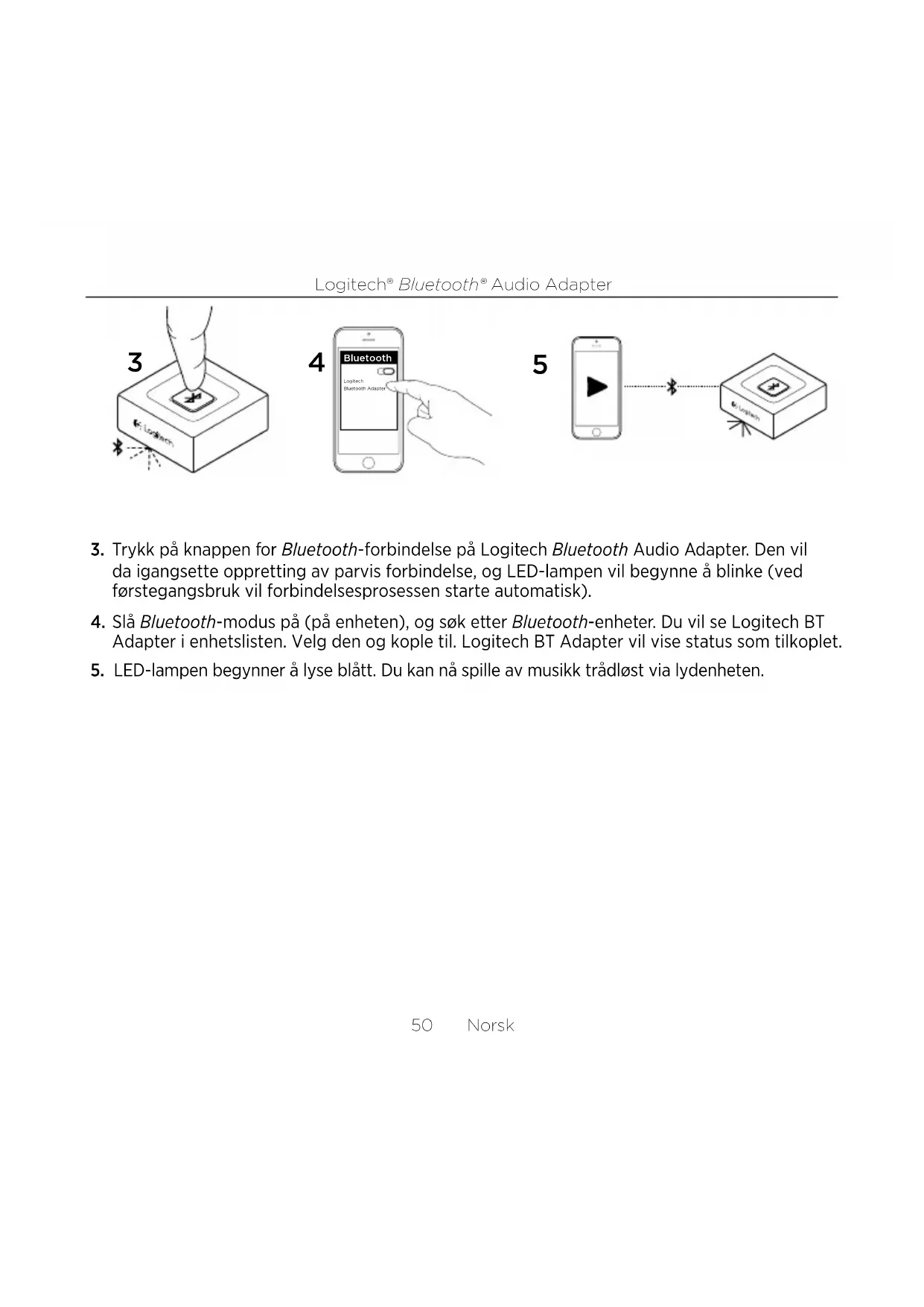 Adapter i enhetslisten. Velg den og kople til. Logitech BT Adapter vil vise status som tilkoplet. 5. LED-lampen begynner å lyse blått. Du kan nå spille av musikk trådløst via lydenheten.Logitech® Bluetooth® Audio Adapter 51 Norsk Kople til to enheter samtidig