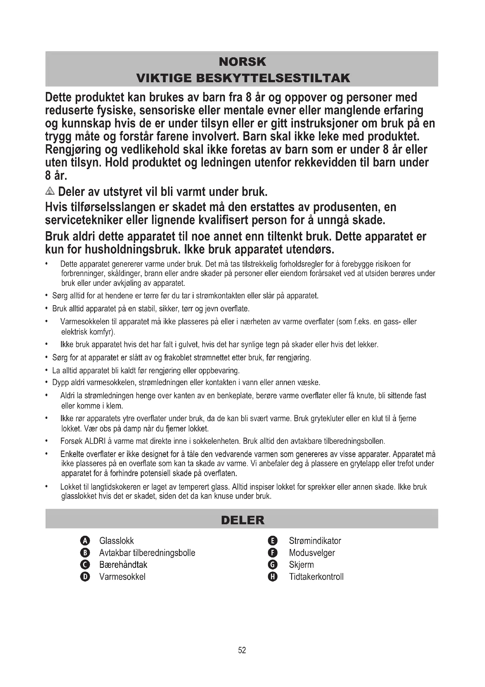 - Lokket til langtidskokeren er laget av temperert glass. Alltid inspiser lokket for sprekker eller annen skade. Ikke bruk glasslokket hvis det er skadet, siden det da kan knuse under bruk. DELER