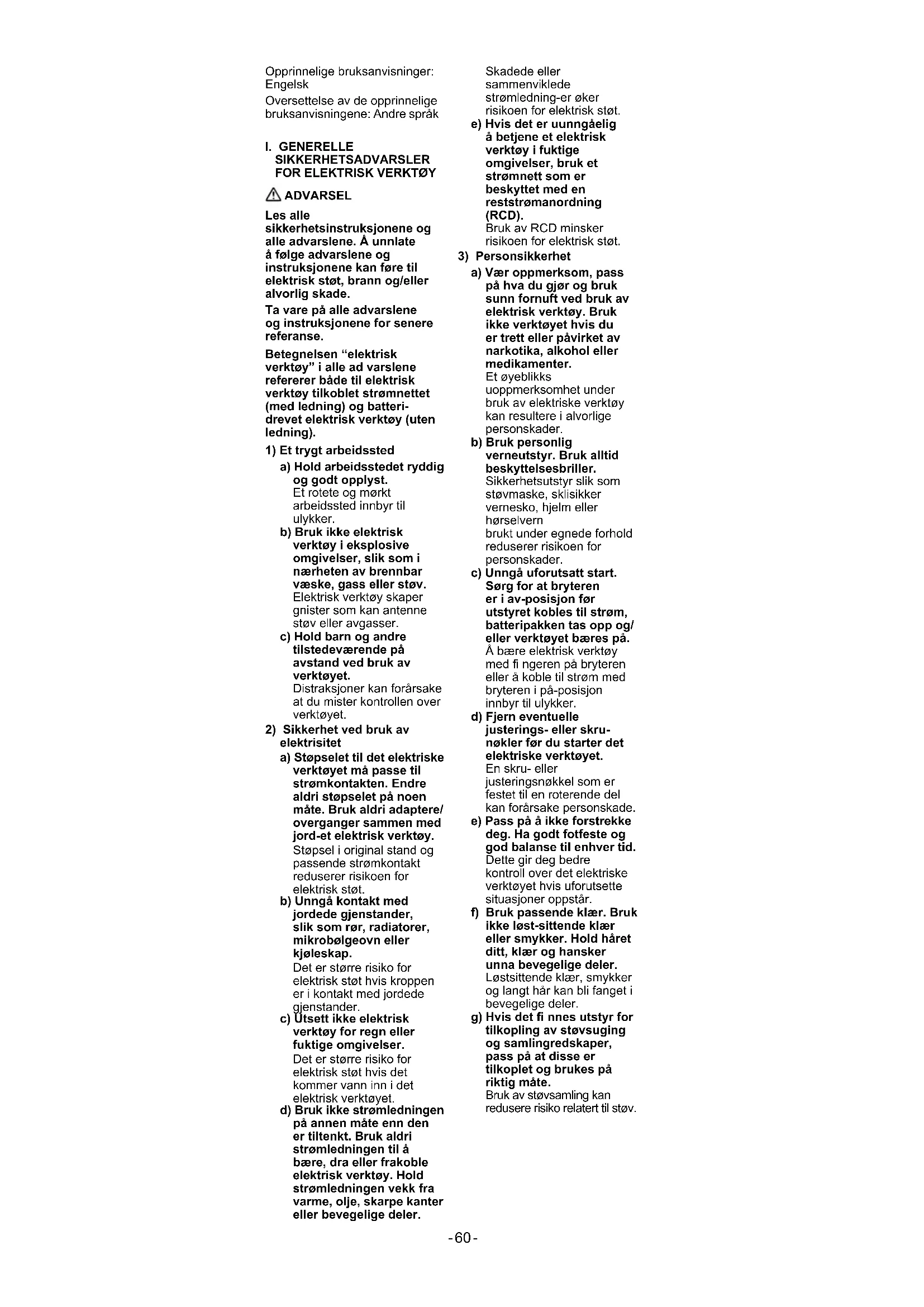 ADVARSEL Les alle sikkerhetsinstruksjonene og alle advarslene. Å unnlate å følge advarslene og instruksjonene kan føre til elektrisk støt, brann og/eller alvorlig skade. Ta vare på alle advarslene og instruksjonene for senere referanse. Betegnelsen “elektrisk verktøy” i alle ad varslene refererer både til elektrisk verktøy tilkoblet strømnettet (med ledning) og batteri- drevet elektrisk verktøy (uten ledning).