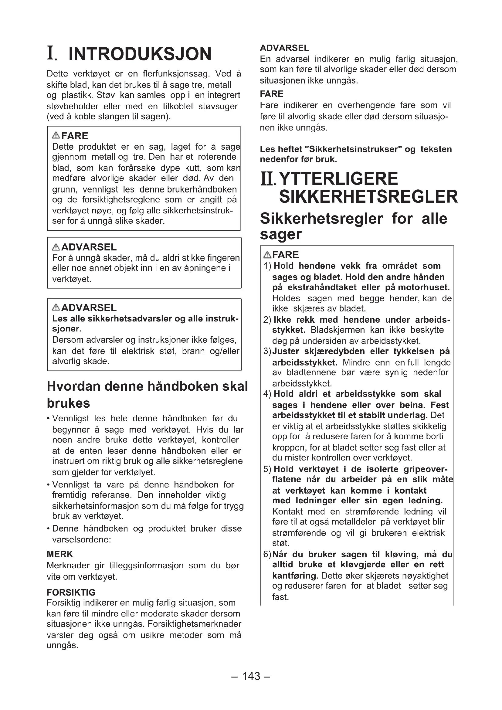 - Vennligst les hele denne håndboken før du begynner å sage med verktøyet. Hvis du lar noen andre bruke dette verktøyet, kontroller at de enten leser denne håndboken eller er instruert om riktig bruk og alle sikkerhetsreglene som gjelder for verktølyet.• Vennligst ta vare på denne håndboken for fremtidig referanse. Den inneholder viktig sikkerhetsinformasjon som du må følge for trygg bruk av verktøyet.• Denne håndboken og produktet bruker disse varselsordene: MERK Merknader gir tilleggsinformasjon som du bør vite om verktøyet.FORSIKTIGForsiktig indikerer en mulig farlig situasjon, som kan føre til mindre eller moderate skader dersom situasjonen ikke unngås. Forsiktighetsmerknader varsler deg også om usikre metoder som må unngås.ADVARSELEn advarsel indikerer en mulig farlig situasjon, som kan føre til alvorlige skader eller død dersom situasjonen ikke unngås. FARE Fare indikerer en overhengende fare som vil føre til alvorlig skade eller død dersom situasjo-nen ikke unngås.Les heftet "Sikkerhetsinstrukser" og teksten nedenfor før bruk.