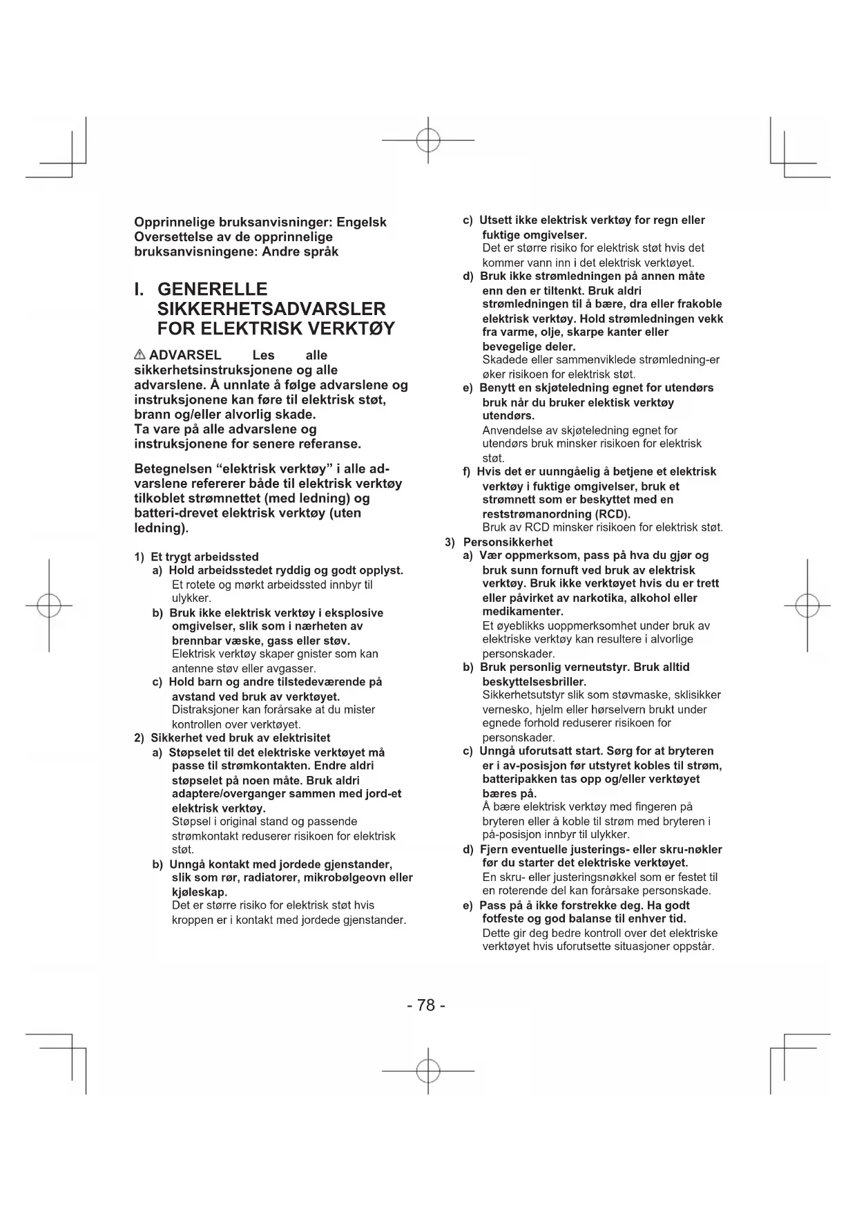 ADVARSEL Les alle sikkerhetsinstruksjonene og alle advarslene. Å unnlate å følge advarslene og instruksjonene kan føre til elektrisk støt, brann og/eller alvorlig skade. Ta vare på alle advarslene og instruksjonene for senere referanse. Betegnelsen “elektrisk verktøy” i alle ad- varslene refererer både til elektrisk verktøy tilkoblet strømnettet (med ledning) og batteri-drevet elektrisk verktøy (uten ledning).