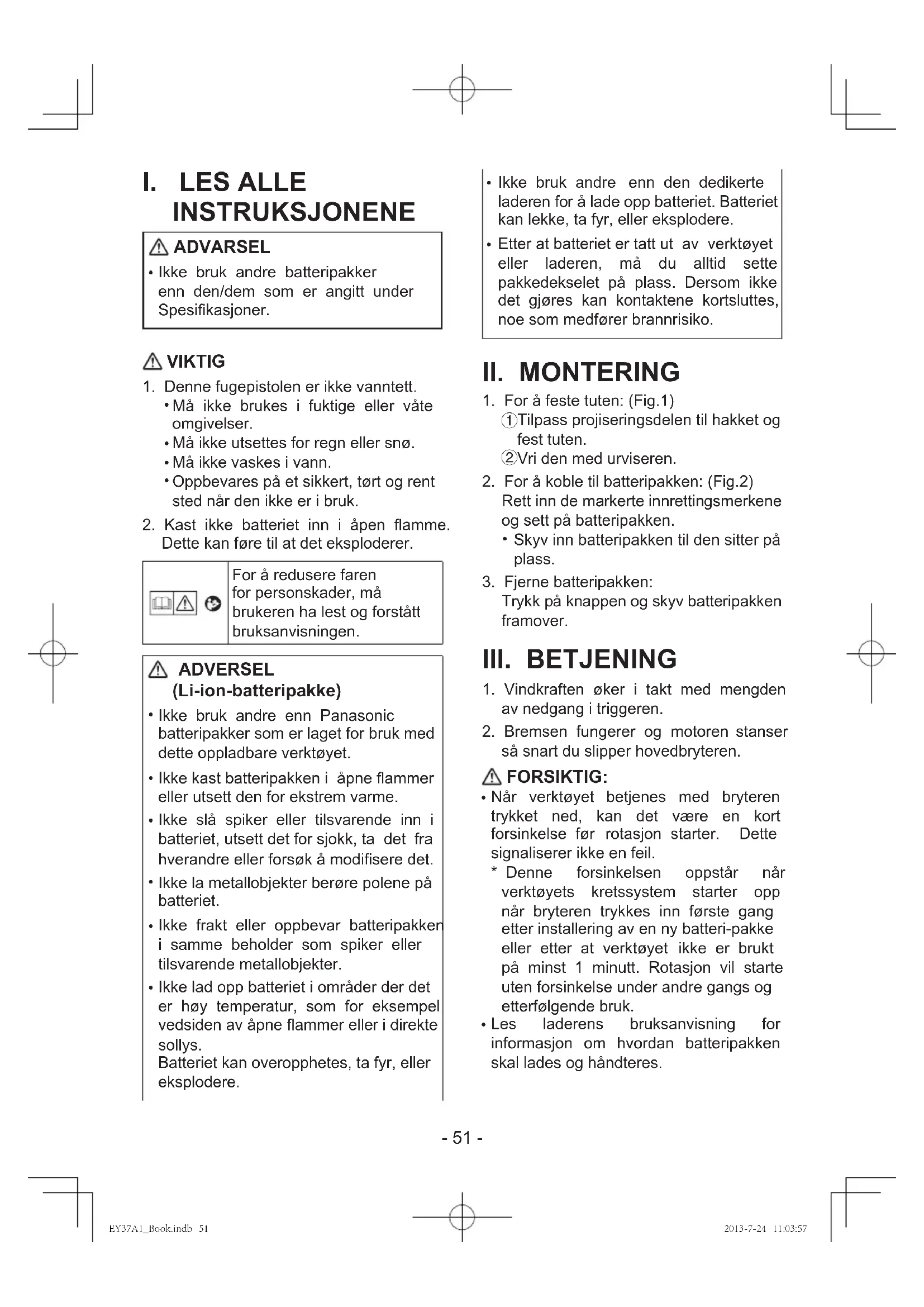 er koblet til batteriladeren igjen, vil indikatorlampen lyse. Etter noen minutter slår den grønne ladelampen seg av. EY37A1_Book.indb 53 2013-7-24 11:03:57- 54 - Brukerinformasjon om innsamling og håndtering av gammelt utstyr og brukte batterier Slike symboler på produkter, emballasje, og/eller på medfølgende dokumenter betyr at brukte elektriske/elektroniske produkter og batterier ikke må blandes med vanlig husholdningsavfall. For riktig håndtering og gjenvinning av gamle produkter og brukte batterier, vennligst lever dem til anvendelige innsamlingssteder, i samsvar med nasjonal lovgivning og direktivene 2002/96/EC og 2006/66/EC. Ved riktig håndtering av disse produktene og batteriene, hjelper du til med å spare verdifulle ressurser og forhindre potensielle negative effekter på menneskers helse og miljøet, som ellers kan oppstå ved uriktig avfallshåndtering. For mer informasjon om innsamling og gjenvinning av gamle produkter og batterier, vennligst ta kontakt med kommunen, ditt renovasjonsselskap eller stedet der du kjøpte gjenstandene. Ukorrekt håndtering av dette avfallet kan medføre straffansvar, i overensstemmelse med nasjonal lovgivning. LAMPEINDIKATORER Ladingen er ferdig. (Ladet helt opp) Batteriet er oppladet ca. 80%. Lading pågår. (Grønn) Slått av Slått på Blinker (Oransje) Laderen koples til vekselstrømskontakten. Klar til lading. Ladestatuslampe Det lyser grønt (til venstre) og oransjegult (til høyre). Batteripakke er avkjølt. Oppladingen av batteripakke foregår langsomt for å redusere belastning på batteriet. Batteripakken er varm. Ladingen vil starte når batteripakkens temperatur synker. Dersom temperaturen på batteripakken er –10°C eller under, vil ladelampen (oransje) også begynne å blinke. Opladingen vil starte igjen når temperaturen på batteripakken stiger. Lading ikke mulig. Tett av støv eller feil med batteripakken. EY37A1_Book.indb 54 2013-7-24 11:03:58- 55 - For forretningsdrivende brukere i EU Dersom du ønsker å kaste elektrisk og elektronisk utstyr, vennligst ta kontakt med din forhandler eller leverandør for videre informasjon. (Informasjon om håndtering i land utenfor EU) Disse symbolene gjelder bare innenfor EU. Ønsker du å kaste slike gjenstander, vennligst kontakt dine lokale myndigheter eller forhandler og spør etter riktig fremgangsmåte for håndtering.