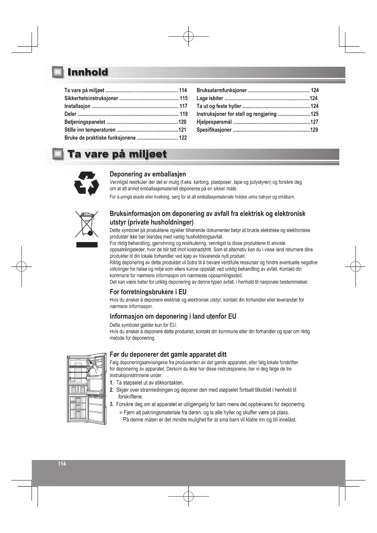 Energiförbrukningen per år är baserad på standardtestresultaten för 24 timmar. Verklig energiförbrukningen varierar beroende på hur produkten används och var den är placerad. När dörrarna är helt öppna 299 mm 120 º 1095 mm114114 Deponering av emballasjen Vennligst resirkuler der det er mulig (f.eks. kartong, plastposer, tape og polystyren) og forsikre deg om at alt annet emballasjemateriell deponeres på en sikker måte. For å unngå skade eller kvelning, sørg for at alt emballasjemateriale holdes unna babyer og småbarn. Bruksinformasjon om deponering av avfall fra elektrisk og elektronisk utstyr (private husholdninger) Dette symbolet på produktene og/eller tilhørende dokumenter betyr at brukte elektriske og elektroniske produkter ikke bør blandes med vanlig husholdningsavfall. For riktig behandling, gjenvinning og resirkulering, vennligst ta disse produktene til anviste oppsamlingsteder, hvor de blir tatt imot kostnadsfritt. Som et alternativ kan du i visse land returnere dine produkter til din lokale forhandler ved kjøp av tilsvarende nytt produkt. Riktig deponering av dette produktet vil bidra til å bevare verdifulle ressurser og hindre eventuelle negative virkninger for helse og miljø som ellers kunne oppstått ved uriktig behandling av avfall. Kontakt din kommune for nærmere informasjon om nærmeste oppsamlingssted. Det kan være bøter for uriktig deponering av denne typen avfall, i henhold til nasjonale bestemmelser. For forretningsbrukere i EU Hvis du ønsker å deponere elektrisk og elektronisk utstyr, kontakt din forhandler eller leverandør for nærmere informasjon. Informasjon om deponering i land utenfor EU Dette symbolet gjelder kun for EU. Hvis du ønsker å deponere dette produktet, kontakt din kommune eller din forhandler og spør om riktig metode for deponering. Før du deponerer det gamle apparatet ditt Følg deponeringsanvisingene fra produsenten av det gamle apparatet, eller følg lokale forskrifter for deponering av apparatet. Dersom du ikke har disse instruksjonene, ber vi deg følge de tre instruksjonstrinnene under.