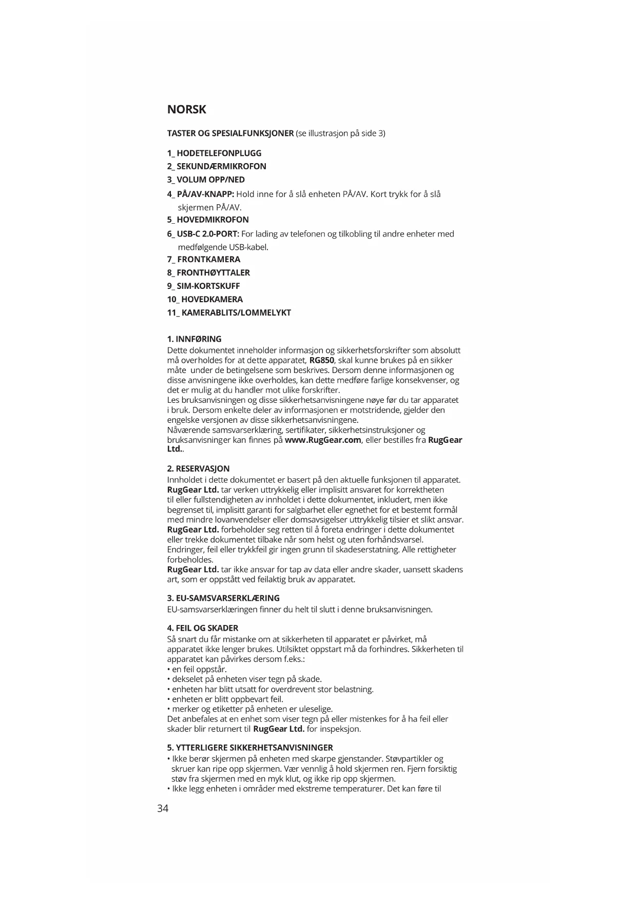 - Brukeren alene er ansvarlig for enhver og alle skader som er forårsaket av skadelig programvare som er nedlastet ved bruk av Internett eller annet datautvekslingsprogram på enheten. RugGear Ltd. kan ikke holdes ansvarlig for noen slike krav.