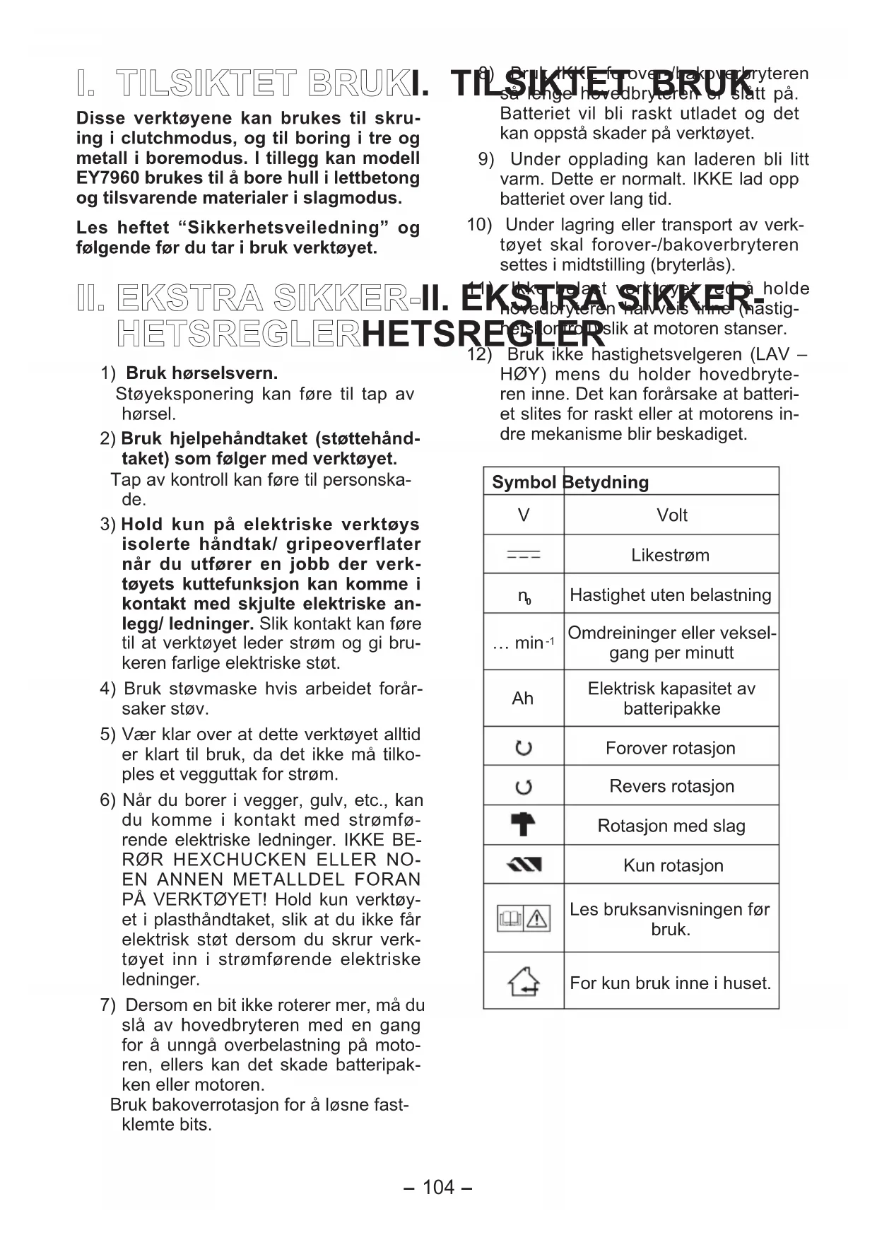 Disse verktøyene kan brukes til skru- ing i clutchmodus, og til boring i tre og metall i boremodus. I tillegg kan modell EY7960 brukes til å bore hull i lettbetong og tilsvarende materialer i slagmodus. Les heftet “Sikkerhetsveiledning” og følgende før du tar i bruk verktøyet.