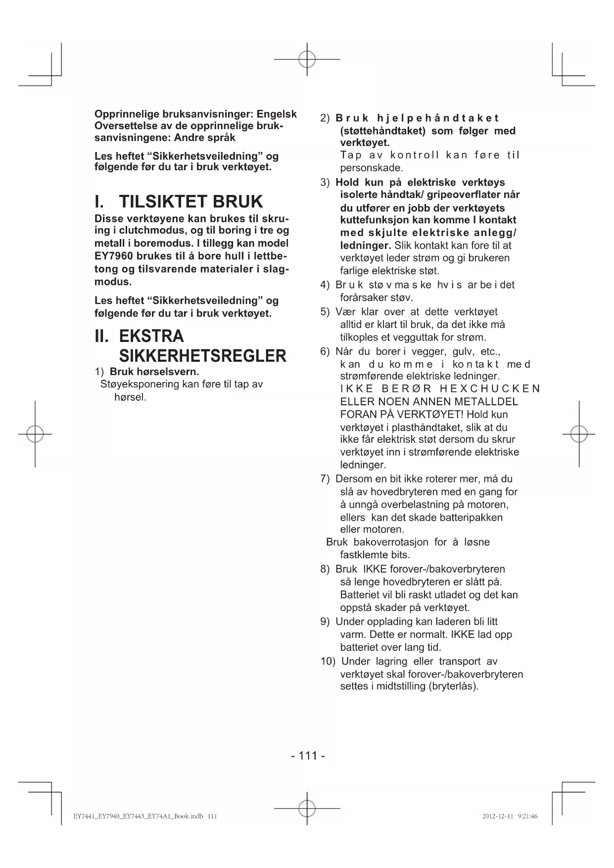 verktøyet skal forover-/bakoverbryteren settes i midtstilling (bryterlås). Opprinnelige bruksanvisninger: Engelsk Oversettelse av de opprinnelige bruk- sanvisningene: Andre språk Les heftet “Sikkerhetsveiledning” og følgende før du tar i bruk verktøyet. EY7441_EY7940_EY7443_EY74A1_Book.indb 111 2012-12-11 9:21:46- 112 -