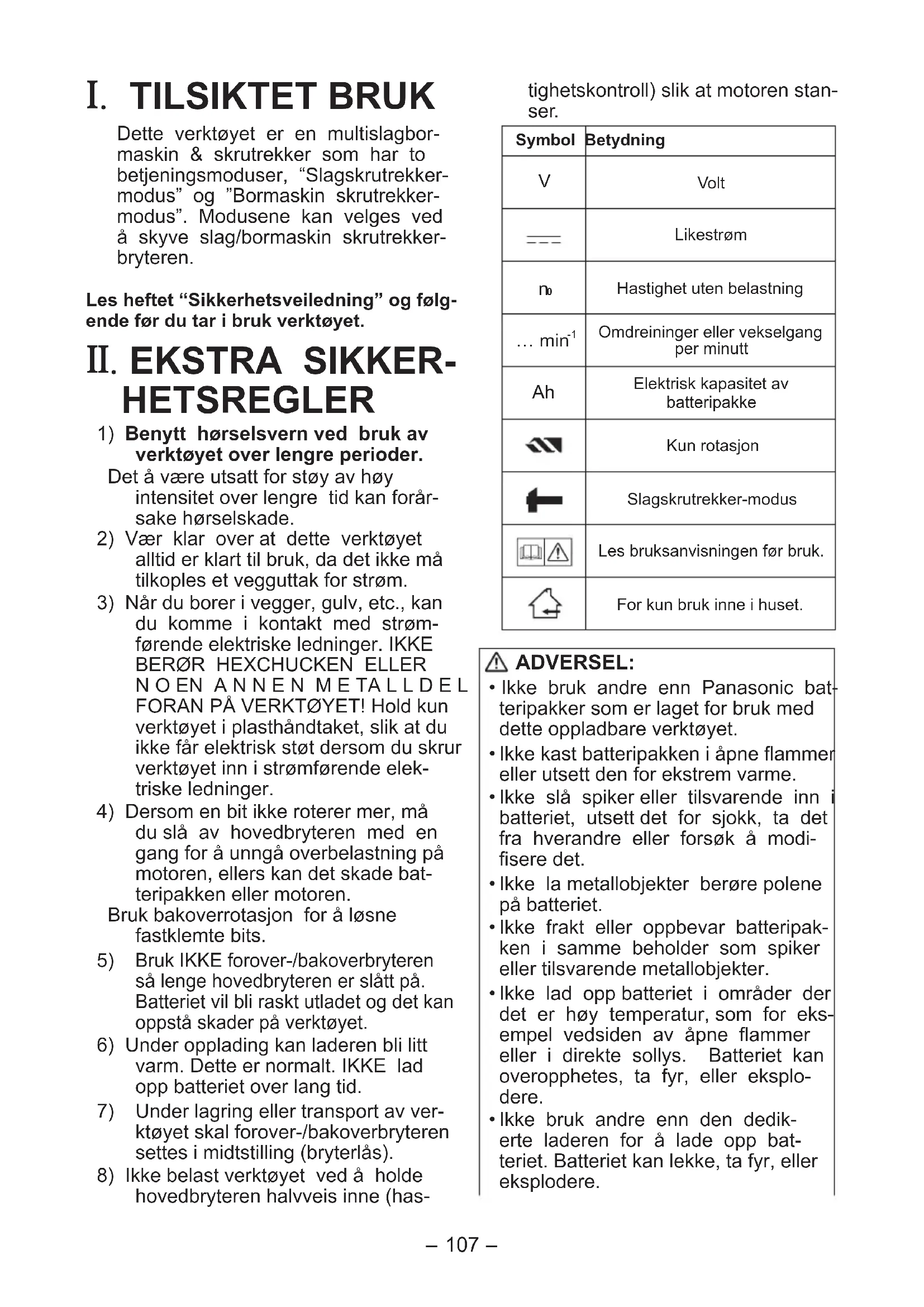 - Ikke bruk andre enn Panasonic batteripakker som er laget for bruk med dette oppladbare verktoyet.