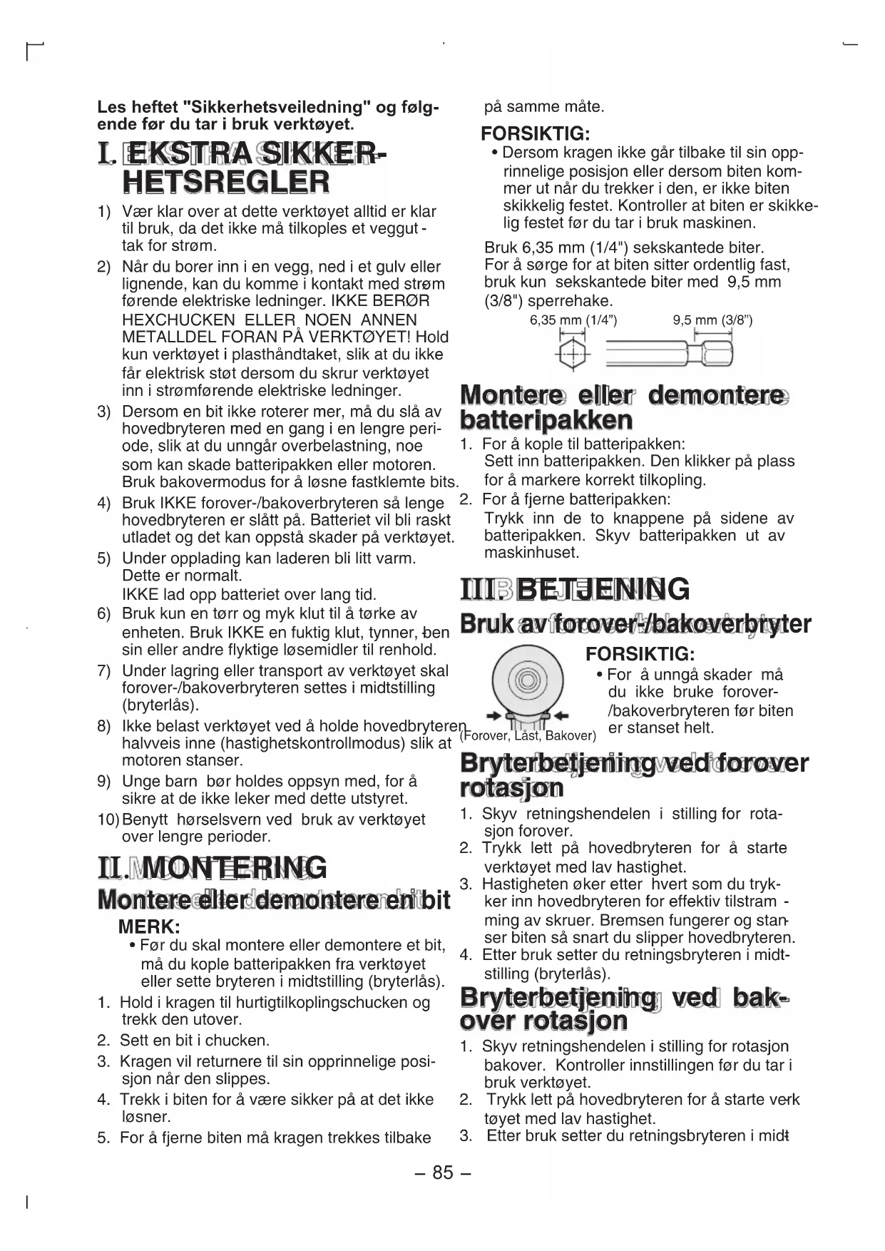- For å unngå skader må du ikke bruke forover-/bakoverbryteren før biten er stanset helt. Bryterbetjening ved forover rotasjon 1. Skyv retningshendelen i stilling for rota-sjon forover.2. Trykk lett på hovedbryteren for å starte verktøyet med lav hastighet.3. Hastigheten øker etter hvert som du tryk-ker inn hovedbryteren for effektiv tilstram ming av skruer. Bremsen fungerer og stan ser biten så snart du slipper hovedbryteren.4. Etter bruk setter du retningsbryteren i midt-stilling (bryterlås). Bryterbetjening ved bak- over rotasjon 1. Skyv retningshendelen i stilling for rotasjon bakover. Kontroller innstillingen før du tar i bruk verktøyet.2. Trykk lett på hovedbryteren for å starte verk tøyet med lav hastighet.3. Etter bruk setter du retningsbryteren i midt