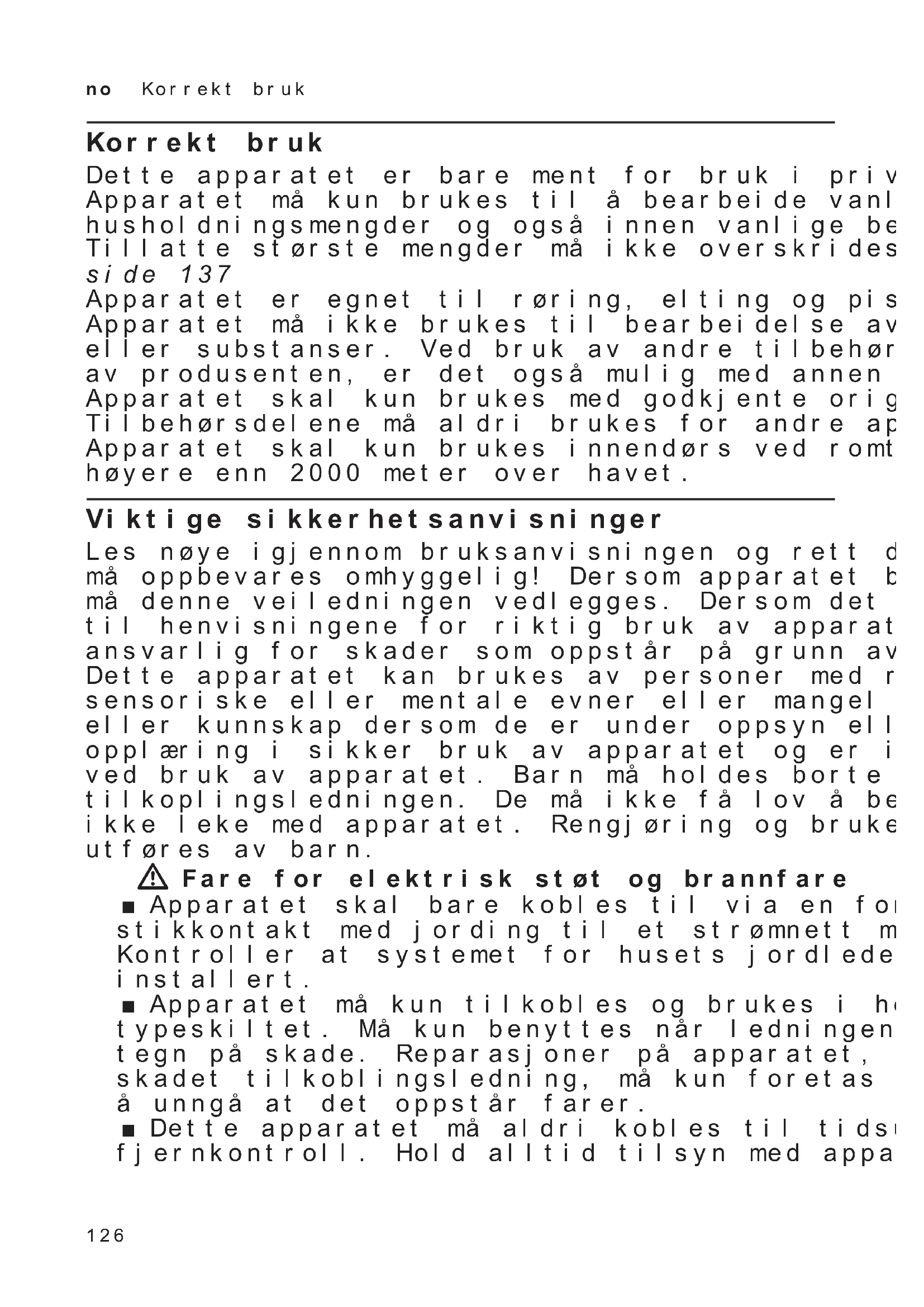 drevet, med utløpsåpning for matvarer, f.eks. gjennomløpskutter. Viktig: ■ Vær oppmerksom på gul, rød eller svart markering på drev og tilbehør. X ”Fargekoding” se side 129 ■ Drev som ikke blir brukt, må alltid dekkes til med beskyttelseslokk for drev. ■ Alle videre trinn finner du i tilhørende, separate bruksanvisning for tilbehøret. Rengjøring og pleie Apparatet og alt verktøy som brukes, må rengjøres grundig etter hver bruk. X Bilde N W Fare for elektrisk støt! – Før rengjøring må støpselet trekkes ut. – Basisapparatet må aldri dyppes ned i væske og må heller ikke rengjøres i oppvaskmaskin. – Ikke bruk damprenser. Obs! – Ikke bruk rengjøringsmidler som inneholder alkohol eller sprit. – Ikke bruk skarpe, spisse gjenstander eller metallgjenstander. – Ikke bruk skurekluter eller skurende rengjøringsmidler. – Plastdelene må ikke klemmes fast i maskinen, for da kan de bli varig deformert! Rengjøring av basisapparatet ■ Ta av beskyttelseslokket for drevet. ■ Tørk basisapparatet og beskyttelseslok- ket for drevet rent med en myk, fuktig klut og gni det deretter tørt. Rengjøring av bolle og verktøy ■ Rengjør bollen, lokket og verktøyet med såpevann og en myk klut eller svamp, eller legg dem i oppvaskmaskinen. ■ Alle delene må tørkes. Oppskrifter Stivpisket kremfløte – 200-1500 g ■ Bearbeid fløten med ”Profi”- vispen i 1½ til 4 minutter på trinn 7, avhengig av mengde og fløtens egenskaper. Merk: Bruk automatikkprogrammet på modeller med SensorControl Plus. X ”Bruk av SensorControl Plus” se side 134 Eggehvite – 2-12 eggehviter ■ Eggehvitene bearbeides med ”Profi”-vispen i 4 til 6 minutter på trinn 7. Merk: Bruk automatikkprogrammet på modeller med SensorControl Plus. X ”Bruk av SensorControl Plus” se side 134 Sukkerbrødrøre Grunnoppskrift – 3 egg – 3-4 ss varmt vann – 150 g sukker – 10 g vaniljesukker – 150 g mel – 50 g potetmel – ev. bakepulver ■ Visp alt sammen (unntatt mel og potetmel) i ca. 4-6 minutter på trinn 7 med ”Profi”-vispen til det skummer. ■ Dreiebryteren settes på trinn 1 og det siktede melet og potetmelet røres inn i ca. ½ til 1 minutt. Fyll på èn skje av gangen. Største mengde: 2 x grunnoppskriften138 no Fininnstilling av verktøyet Rørt deig Grunnoppskrift – 3-4 egg – 200-250 g sukker – 1 klype salt – 10 g vaniljesukker eller skall av ½ sitron – 200-250 g smør eller margarin (romtemperatur) – 500 g mel – 12 g bakepulver – 150 ml melk ■ Alle ingrediensene røres sammen i ca. ½ minutt på trinn 2, deretter i ca. 2-3 minutter på trinn 7 med ”Profi Flexi ”-rørepinnen. Største mengde: 2 ½ x grunnoppskriften Mørdeig Grunnoppskrift – 125 g smør (romtemperatur) – 100-125 g sukker – 1 egg – 1 klype salt – litt skall av sitron eller vaniljesukker – 250 g mel – ev. bakepulver ■ Bearbeid alle ingrediensene i ca. ½ minutt på trinn 2, deretter i ca. 2-3 minutter på trinn 6 med ”Profi Flexi”-rørepinnen. Fra og med 500 g mel: ■ Elt ingrediensene med eltekroken i ca. ½ minutt på trinn 1, deretter i ca. 3-4 minutter på trinn 3. Største mengde: 4 x grunnoppskriften Gjærdeig Grunnoppskrift – 500 g mel – 1 egg – 80 g fett (romtemperatur) – 80 g sukker – 200-250 ml lunken melk – 25 g fersk gjær eller 1 pakke tørrgjærr – Skall av ½ sitron – 1 klype salt ■ Alle ingrediensene bearbeides i ca. ½ minutt på trinn 1, deretter i ca. 3-6 minutter på trinn 3 med eltekroken. Største mengde: 3 x grunnoppskriften Merk: Bruk automatikkprogrammet på modeller med SensorControl Plus. X ”Bruk av SensorControl Plus” se side 134 Pastadeig Grunnoppskrift – 500 g mel – 250 g egg (ca. 5 stk.) – etter behov 2-3 ss (20-30 g) kaldt vann ■ Alle ingrediensene bearbeides til en deig i ca. 3 til 5 minutter på trinn 3. Største mengde: 1,5 x grunnoppskriften Brøddeig Grunnoppskrift – 1000 g mel – 75 g fersk gjær eller 3 pk tørrgjær – 2 ts salt – 660 ml varmt vann ■ Alle ingrediensene bearbeides i ca. ½ minutt på trinn 1, deretter i ca. 4-5 minutter på trinn 3 med eltekroken. Største mengde: 1,5 x grunnoppskriften Fininnstilling av verktøyet W Fare for skade! Før finjusteringen må støpselet trekkes ut. Obs! Finjusteringen av verktøyet skal alltid utføres i små trinn. Svingarmen må kunne senkes helt ned, og verktøyet må ikke klemmes fast i bunnen eller kanten av bollen. Optimal avstand mellom verktøy og bolle er 3 mm. X Bildesekvens O ■ Kontroller den aktuelle innstillingen når ”Profi”-vispen er satt inn. ■ Trykk på utløsningstasten og hev svingarmen til stopp. ■ Hold fast verktøyet med én hånd. Løsne kontramutteren med urviseren med en fastnøkkel (10 mm).139 no Sikringssystemer ■ Still inn avstanden til bollen ved å dreie på verktøyet (1 hel omdreining svarer til en høydejustering på 1 mm). Dreining mot urviseren: Avstanden til bollen blir mindre. Dreining med urviseren: Avstanden til bollen blir større. ■ Trykk på utløsningstasten og press svingarmen ned til den går i lås. ■ Kontroller verktøyets avstand. Optimal avstand mellom verktøy og bolle er 3 mm. Juster avstanden ved behov. ■ Når avstanden er innstilt optimalt, kan du trykke på utløsningstasten og vippe svingarmen tilbake. ■ Hold fast verktøyet med én hånd. Skru kontramutteren fast mot urviseren med en fastnøkkel (10 mm). Sikringssystemer Innkoblingssikring Det er bare mulig å slå apparatet på når bollen er satt inn og dreid til den er gått i lås, eller når et tilbehør med vinkeldrev er festet til hoveddrevet, og når svingarmen er gått i lås i nederste stilling. Sikring mot gjeninnkobling Ved strømbrudd forblir apparatet innkoblet, men motoren starter ikke igjen når strøm- men kommer tilbake. For å slå apparatet på igjen må du først vri dreiebryteren på y og deretter slå den på på nytt. Overlastvern Overlastvernet slår motoren automatisk av un