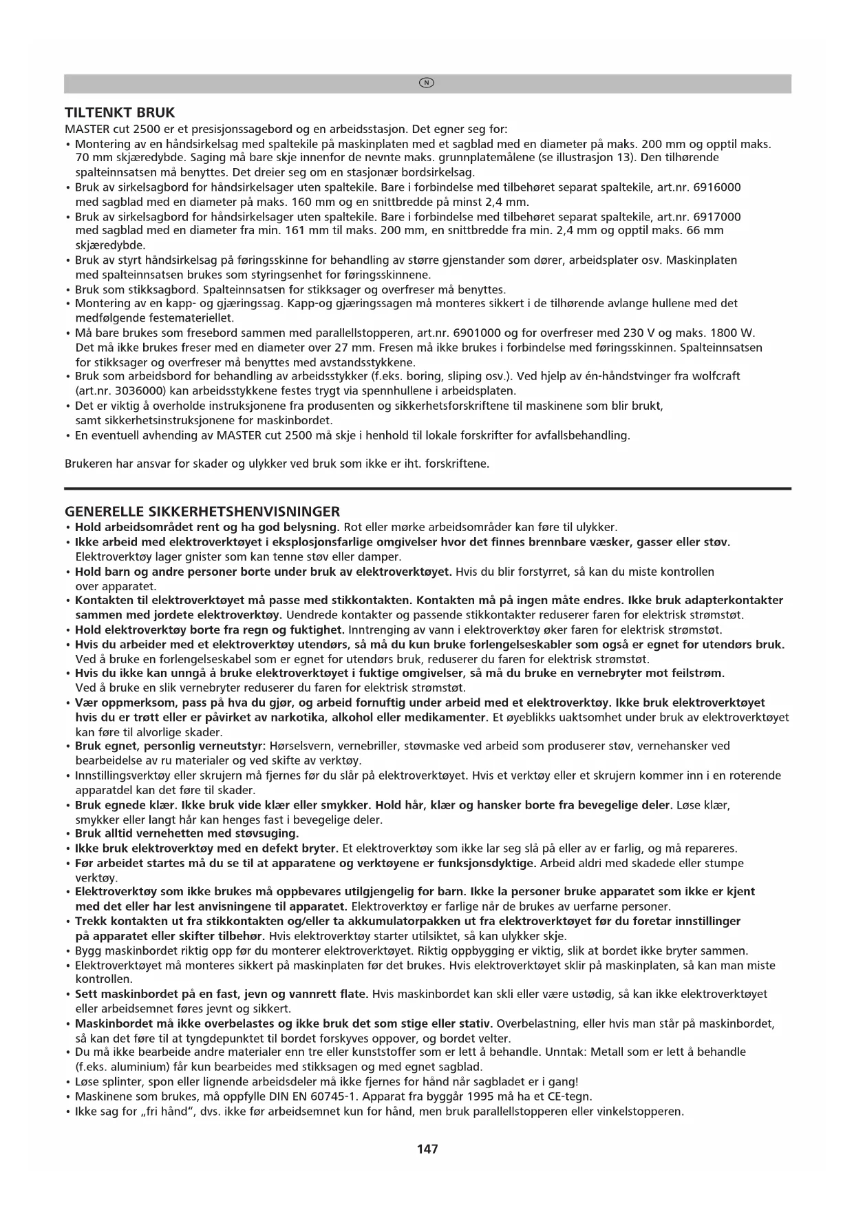 - Maskinene som brukes, må oppfylle DIN EN 60745-1. Apparat fra byggår 1995 må ha et CE-tegn.