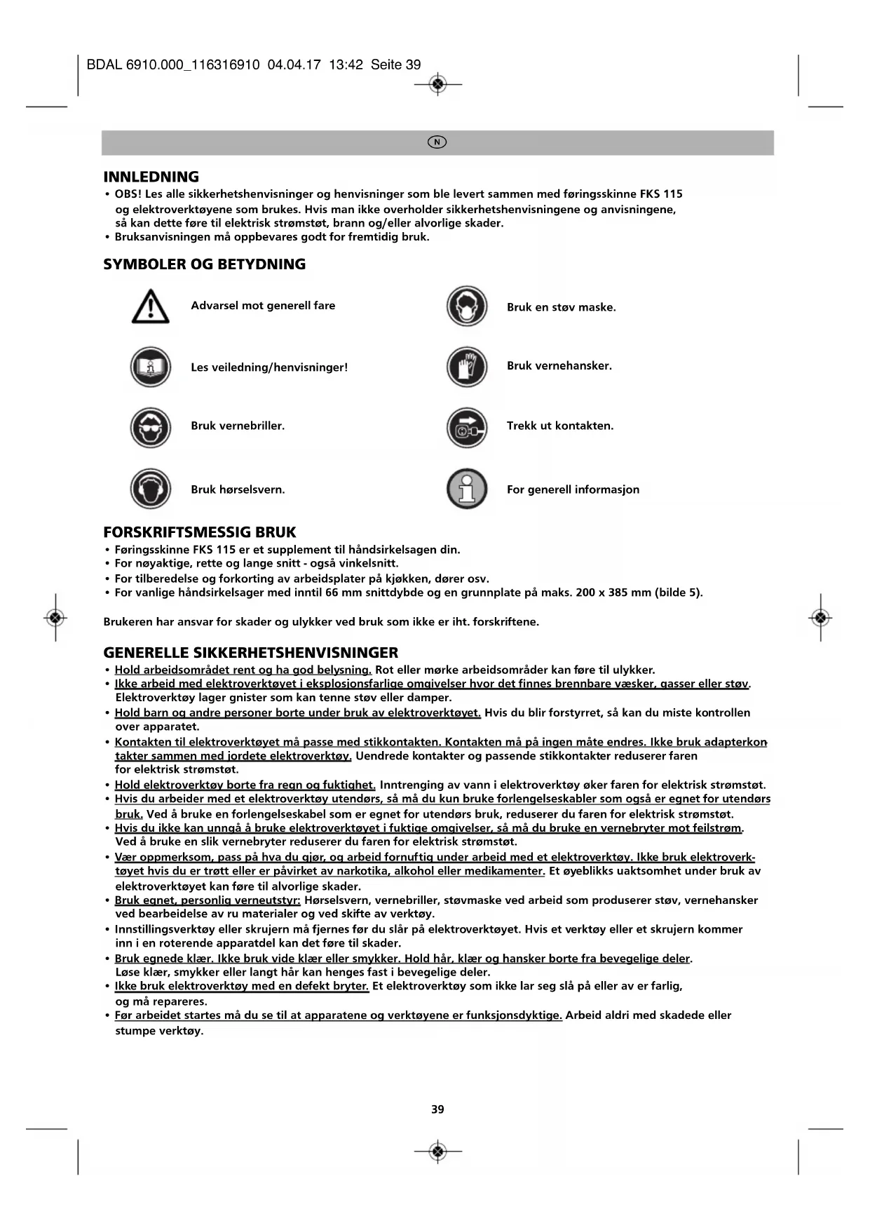 Advarsel mot generell fare Les veiledning/henvisninger! Bruk vernebriller. Bruk hørselsvern. Trekk ut kontakten. For generell informasjon Bruk en støv maske. Bruk vernehansker. BDAL 6910.000_116316910 04.04.17 13:42 Seite 39• Elektroverktøy som ikke brukes må oppbevares utilgjengelig for barn. Ikke la personer bruke apparatet som ikke er kjent med det eller har lest anvisningene til apparatet. Elektroverktøy er farlige når de brukes av uerfarne personer.