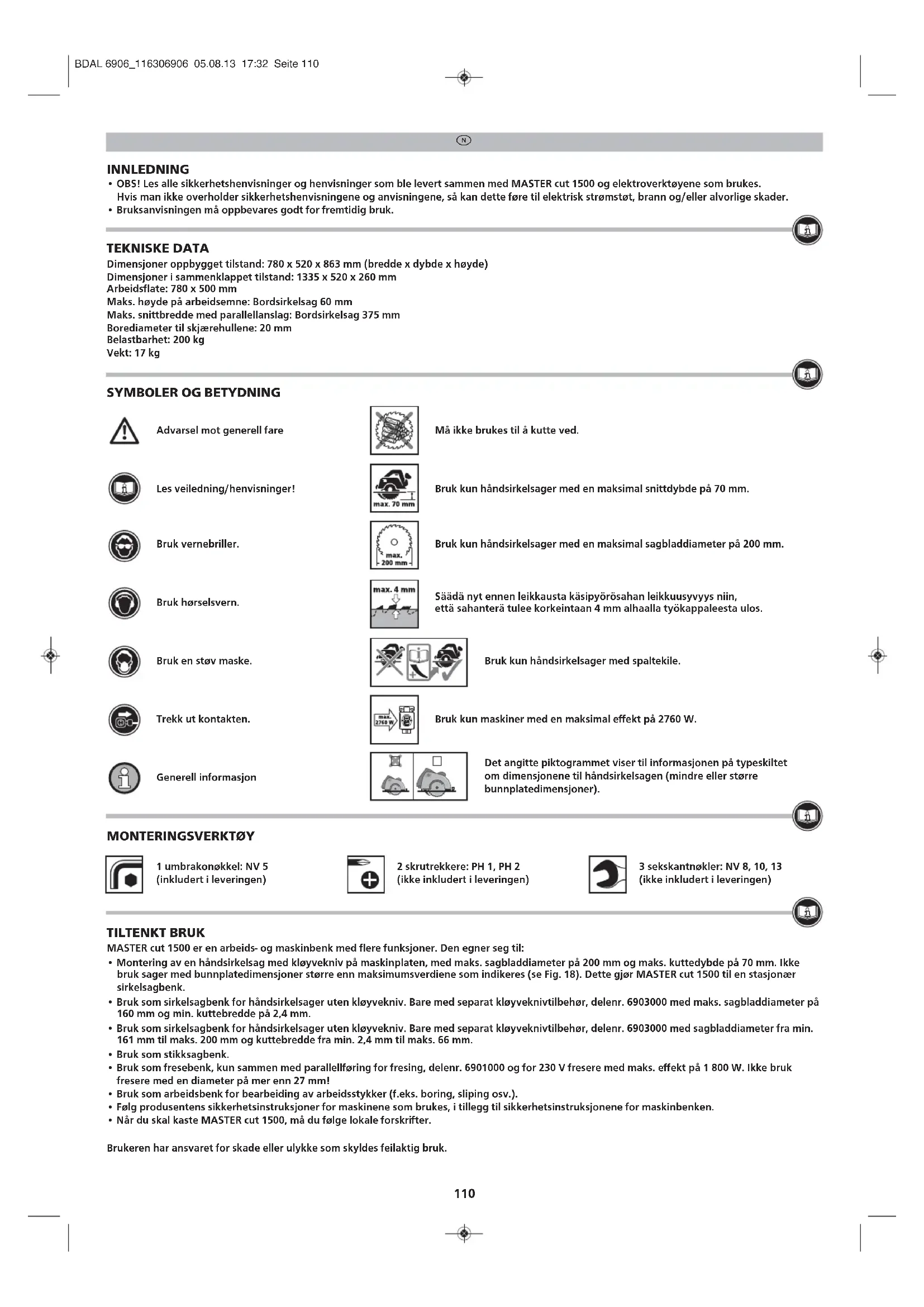 Ta Master cut 1500 ut av esken og sjekk at alt er i orden og at alle avbildede deler følger med (Fig. 1 og 2). GRUNNLEGGENDE MONTERING Montere benken: Plasser benkens toppseksjon på et flatt og rent underlag. Fest det fremre benparet og den nedre avstiveren med alle festeanordningene som vist i illustrasjonen. Påse at de to låsespakene sitter korrekt i festehullene og at begge fingerskruene er godt strammet til (Fig. 3.1). Monter deretter det bakre benparet og den nest laveste avstiveren. Fest de to tverravstiverne til det fremre benparet. Fold deretter det bakre benparet opp og fest den andre enden av de to tverravstiverne (Fig. 3.2). Fest så de to føttene med hjul til det bakre benparet som vist, og de andre to føttene på det fremre benparet (Fig. 3.3). FORSIKTIG: Påse at festeanordningene som er merket med et informasjonssymbol, kun strammes til slik at benken kan foldes sammen med minimal motstand. Sjekk alltid at begge sikkerhetsbrakettene tar tak og at begge fingerskruene er godt strammet. Benken kan nå settes ned på bena. FORSIKTIG: Vær forsiktig så du ikke klemmer hendene når du folder benken sammen eller ut eller når du dreier på maskinplaten. Tvinge: Monter tvingen på maskinbenken som illustrert. Tvingen kan monteres på høyre eller venstre side (Fig. 4). Sikkerhetsbryter: Monter sikkerhetsbryteren på maskinbenken som illustrert (Fig. 5). BDAL 6906_116306906 05.08.13 17:32 Seite 112113 Beskyttende hette: Monter først de individuelle komponentene til den beskyttende hetten. Skyv deretter hetteholderen sammen med føringen inn i aluminiumprofilen og stram til de to unbrakoskruene med unbrakonøkkelen (Fig. 6). Koblingsklemme: Fest den ene enden av snoren i hullet på koblingsklemmen og den andre enden på hetteholderen (Fig. 7). Skyvestang: Heng skyvestangen på holderen (Fig. 8). Vinkelføring: Monter vinkelføringen som vist (Fig. 9). Aluminiumsskinnen må kanskje justeres, avhengig av høyden på arbeidsstykket. Vertikalt med en minste arbeidsstykkehøyde på 15 mm (Fig. 9.1.), horisontalt med en maksimal arbeidsstykkehøyde på 15 mm (Fig. 9.1). Vinkelføringen styrer arbeidsstykket inn i føringsrillen (Fig. 9.3). Parallellføring: Monter føringsholderen som vist (Fig. 10.1). Sett de to skruene og firkantmutrene løst i (Fig. 10.2). Skyv aluminiumføringen inn som vist og stram til skruene (Fig. 10.3). Skyv deretter parallellføringen inn i sporet og stram til fingerskruen (Fig. 10.4). FORSIKTIG: Lås fast maskinplaten: Unbrakonøkkelen brukes til å låse maskinplaten og må settes inn i benken i «låst» posisjon som vist før arbeidet kan starte (Fig. 11). Avstandsringer: De to avstandsringene er beregnet på å øke sikkerhetene ved fresing. Velg alltid den minste mulige avstandsringen for verktøyet som brukes (Fig. 12). Festeklør: Sett festeklørne i de forhåndsborede hullene og bruk dem sammen med tvingen til å feste arbeidsstykkene.