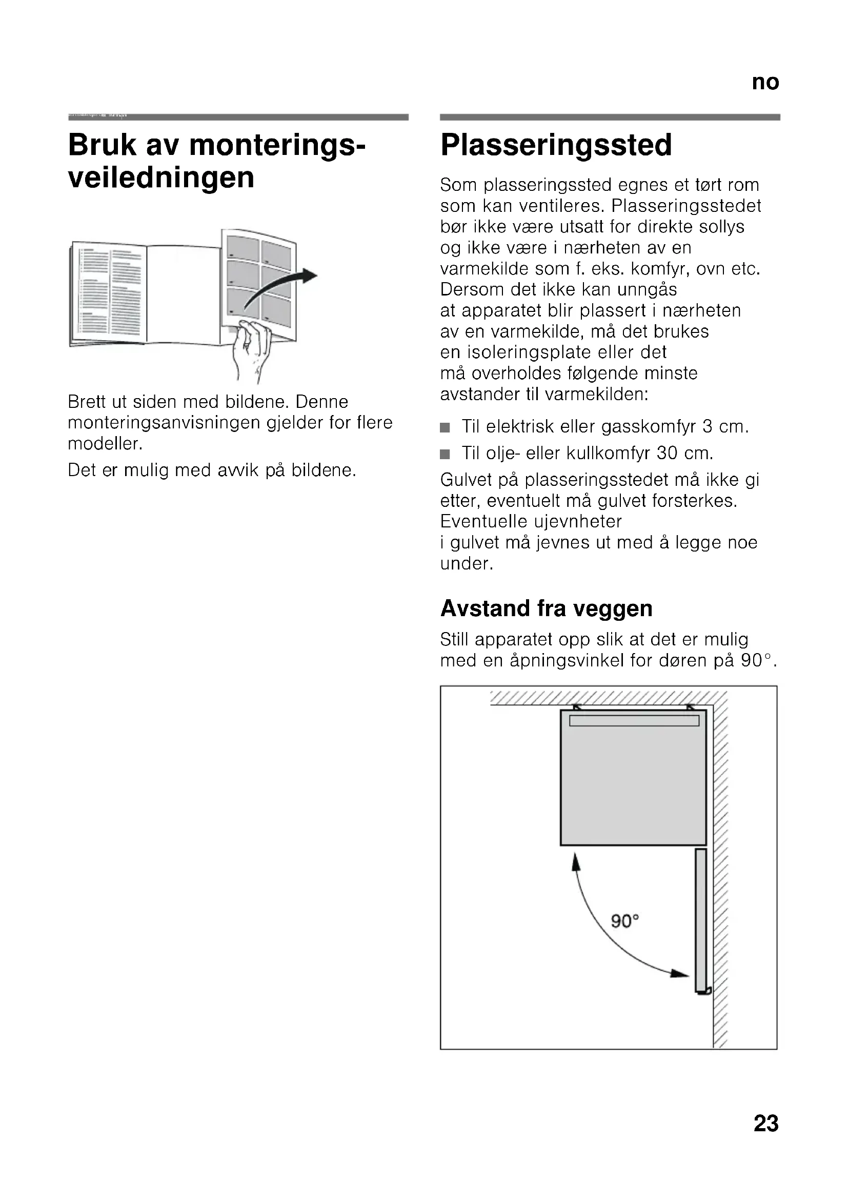 noIn nholdsfortegnel se noMonteringsanvisning F ritts tåen de ap par at Bruk av monterings- veiledningen Brett ut siden med bildene. Denne monteringsanvisningen gjelder for flere modeller. Det er mulig med avvik på bildene. Plasseringssted Som plasseringssted egnes et tørt rom som kan ventileres. Plasseringsstedet bør ikke være utsatt for direkte sollys og ikke være i nærheten av en varmekilde som f. eks. komfyr, ovn etc. Dersom det ikke kan unngås at apparatet blir plassert i nærheten av en varmekilde, må det brukes en isoleringsplate eller det må overholdes følgende minste avstander til varmekilden: ■ Til elektrisk eller gasskomfyr 3 cm. ■ Til olje- eller kullkomfyr 30 cm. Gulvet på plasseringsstedet må ikke gi etter, eventuelt må gulvet forsterkes. Eventuelle ujevnheter i gulvet må jevnes ut med å legge noe under. Avstand fra veggen Still apparatet opp slik at det er mulig med en åpningsvinkel for døren på 90°.no