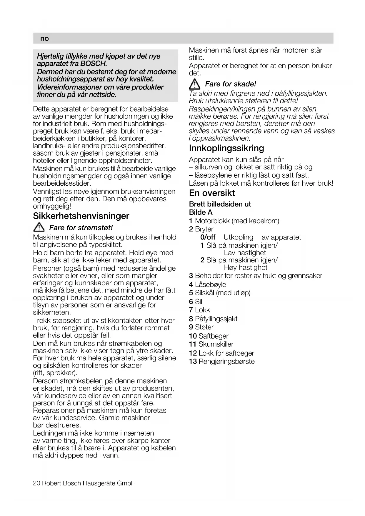 Ændringer forbeholdes.20 Robert Bosch Hausgeräte GmbH Dette apparatet er beregnet for bearbeidelse av vanlige mengder for husholdningen og ikke for industrielt bruk. Rom med husholdnings- preget bruk kan være f. eks. bruk i medar- beiderkjøkken i butikker, på kontorer, landbruks- eller andre produksjonsbedrifter, såsom bruk av gjester i pensjonater, små hoteller eller lignende oppholdsenheter. Maskinen må kun brukes til å bearbeide vanlige husholdningsmengder og også innen vanlige bearbeidelsestider. Vennligst les nøye igjennom bruksanvisningen og rett deg etter den. Den må oppbevares omhyggelig! Sikkerhetshenvisninger c~êÉ=Ñçê=ëíê›ãëí›í> Maskinen må kun tilkoples og brukes i henhold til angivelsene på typeskiltet. Hold barn borte fra apparatet. Hold øye med barn, slik at de ikke leker med apparatet. Personer (også barn) med reduserte åndelige svakheter eller evner, eller som mangler erfaringer og kunnskaper om apparatet, må ikke få betjene det, med mindre de har fått opplæring i bruken av apparatet og under tilsyn av personer som er ansvarlige for sikkerheten. Trekk støpselet ut av stikkontakten etter hver bruk, før rengjøring, hvis du forlater rommet eller hvis det oppstår feil. Den må kun brukes når strømkabelen og maskinen selv ikke viser tegn på ytre skader. Før hver bruk må hele apparatet, særlig silene og silskålen kontrolleres for skader (rift, sprekker). Dersom strømkabelen på denne maskinen er skadet, må den skiftes ut av produsenten, vår kundeservice eller av en annen kvalifisert person for å unngå at det oppstår fare. Reparasjoner på maskinen må kun foretas av vår kundeservice. Gamle maskiner bør destrueres. Ledningen må ikke komme i nærheten av varme ting, ikke føres over skarpe kanter eller brukes til å bære i. Apparatet og kabelen må aldri dyppes ned i vann. Maskinen må først åpnes når motoren står stille. Apparatet er beregnet for at en person bruker det. c~êÉ=Ñçê=ëâ~ÇÉ> q~=~äÇêá=ãÉÇ=ÑáåÖêÉåÉ=åÉÇ=á=é™ÑóääáåÖëëà~âíÉåK= _êìâ=ìíÉäìââÉåÇÉ=ëí›íÉêÉå=íáä=ÇÉííÉ> o~ëéÉâäáåÖÉåLâäáåÖÉå=é™=ÄìååÉå=~î=ëáäÉå= ã™ áââÉ=ÄÉê›êÉëK=cçê=êÉåÖà›êáåÖ=ã™=ëáäÉå=Ñ›êëí= êÉåÖà›êÉë=ãÉÇ=Ä›êëíÉåI=ÇÉêÉííÉê=ã™=ÇÉå= ëâóääÉë=ìåÇÉê=êÉååÉåÇÉ=î~åå=çÖ=â~å=ë™=î~ëâÉë= á=çééî~ëâã~ëâáåÉåK Innkoplingssikring Apparatet kan kun slås på når – silkurven og lokket er satt riktig på og – låsebøylene er riktig låst og satt fast. Låsen på lokket må kontrolleres før hver bruk! En oversikt Brett billedsiden ut Bilde A 1 Motorblokk (med kabelrom) 2 Bryter 0/off Utkopling av apparatet 1 Slå på maskinen igjen/ Lav hastighet 2 Slå på maskinen igjen/ Høy hastighet 3 Beholder for rester av frukt og grønnsaker 4 Låsebøyle 5 Silskål (med utløp) 6 Sil 7 Lokk 8 Påfyllingssjakt 9 Støter 10 Saftbeger 11 Skumskiller 12 Lokk for saftbeger 13 Rengjøringsbørste