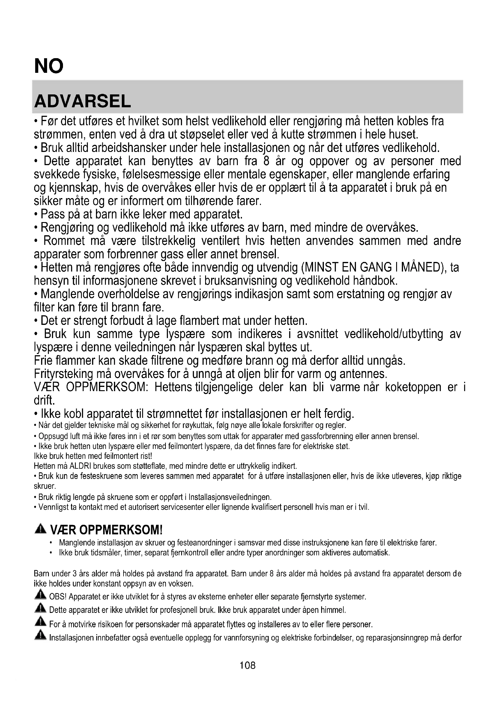 - Rommet må være tilstrekkelig ventilert hvis hetten anvendes sammen med andre apparater som forbrenner gass eller annet brensel.