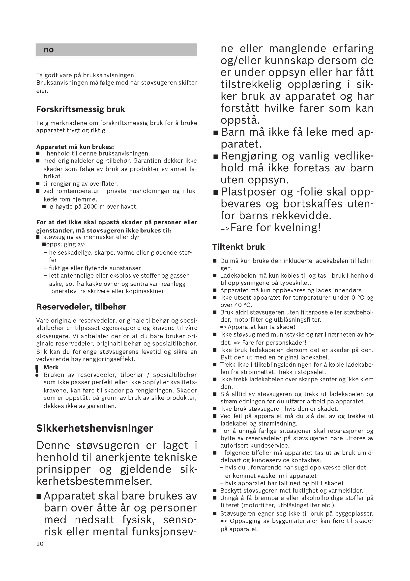 Ta godt vare på bruksanvisningen. Bruksanvisningen må følge med når støvsugeren skifter eier. Forskriftsmessig bruk Følg merknadene om forskriftsmessig bruk for å bruke apparatet trygt og riktig.Apparatet må kun brukes: i henhold til denne bruksanvisningen. med originaldeler og -tilbehør. Garantien dekker ikke skader som følge av bruk av produkter av annet fa- brikat. til rengjøring av overflater. ved romtemperatur i private husholdninger og i luk- kede rom hjemme. i e n høyde på 2000 m over havet. For at det ikke skal oppstå skader på personer eller gjenstander, må støvsugeren ikke brukes til: støvsuging av mennesker eller dyr oppsuging av: −helseskadelige, skarpe, varme eller glødende stof- fer − fuktige eller flytende substanser −lett antennelige eller eksplosive stoffer og gasser − aske, sot fra kakkelovner og sentralvarmeanlegg −tonerstøv fra skrivere eller kopimaskiner Reservedeler, tilbehør Våre originale reservedeler, originale tilbehør og spesi- altilbehør er tilpasset egenskapene og kravene til våre støvsugere . Vi anbefaler derfor at du bare bruker ori- ginale reservedeler, originaltilbehør og spesialtilbehør. Slik kan du forlenge støvsugerens levetid og sikre en vedvare nde høy rengjøringseffekt.