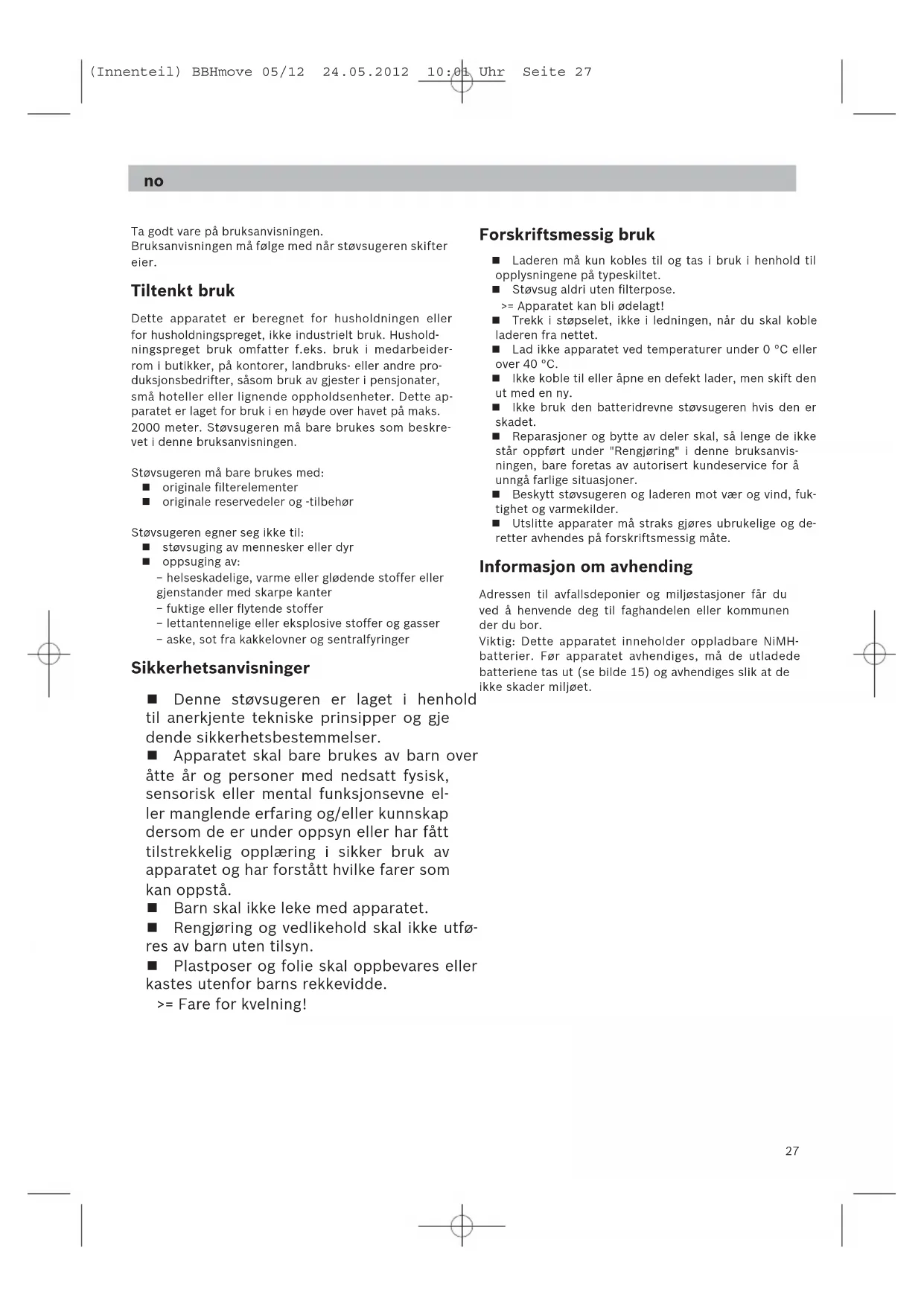 (Innenteil) BBHmove 05/12 24.05.2012 10:01 Uhr Seite 26no (Innenteil) BBHmove 05/12 24.05.2012 10:01 Uhr Seite 27 Ta godt vare på bruksanvisningen. Bruksanvisningen må følge med når støvsugeren skifter eier. Tiltenkt bruk Dette apparatet er beregnet for husholdningen eller for husholdningspreget, ikke industrielt bruk. Hushold- ningspreget bruk omfatter f.eks. bruk i medarbeider- rom i butikker, på kontorer, landbruks- eller andre pro- duksjonsbedrifter, såsom bruk av gjester i pensjonater, små hoteller eller lignende oppholdsenheter. Dette ap- paratet er laget for bruk i en høyde over havet på maks. 2000 meter. Støvsugeren må bare brukes som beskre- vet i denne bruksanvisningen. Støvsugeren må bare brukes med: originale filterelementer originale reservedeler og -tilbehør Støvsugeren egner seg ikke til: støvsuging av mennesker eller dyr oppsuging av: − helseskadelige, varme eller glødende stoffer eller gjenstander med skarpe kanter − fuktige eller flytende stoffer − lettantennelige eller eksplosive stoffer og gasser − aske, sot fra kakkelovner og sentralfyringer Sikkerhetsanvisninger Denne støvsugeren er laget i henhold til anerkjente tekniske prinsipper og gje dende sikkerhetsbestemmelser. Apparatet skal bare brukes av barn over åtte år og personer med nedsatt fysisk, sensorisk eller mental funksjonsevne el- ler manglende erfaring og/eller kunnskap dersom de er under oppsyn eller har fått tilstrekkelig opplæring i sikker bruk av apparatet og har forstått hvilke farer som kan oppstå. Barn skal ikke leke med apparatet. Rengjøring og vedlikehold skal ikke utfø- res av barn uten tilsyn. Plastposer og folie skal oppbevares eller kastes utenfor barns rekkevidde. >= Fare for kvelning! Forskriftsmessig bruk Laderen må kun kobles til og tas i bruk i henhold til opplysningene på typeskiltet. Støvsug aldri uten filterpose. >= Apparatet kan bli ødelagt! Trekk i støpselet, ikke i ledningen, når du skal koble laderen fra nettet. Lad ikke apparatet ved temperaturer under 0 °C eller over 40 °C. Ikke koble til eller åpne en defekt lader, men skift den ut med en ny. Ikke bruk den batteridrevne støvsugeren hvis den er skadet. Reparasjoner og bytte av deler skal, så lenge de ikke står oppført under "Rengjøring" i denne bruksanvis- ningen, bare foretas av autorisert kundeservice for å unngå farlige situasjoner. Beskytt støvsugeren og laderen mot vær og vind, fuk- tighet og varmekilder. Utslitte apparater må straks gjøres ubrukelige og de- retter avhendes på forskriftsmessig måte. Informasjon om avhending Adressen til avfallsdeponier og miljøstasjoner får du ved å henvende deg til faghandelen eller kommunen der du bor. Viktig: Dette apparatet inneholder oppladbare NiMH- batterier. Før apparatet avhendiges, må de utladede batteriene tas ut (se bilde 15) og avhendiges slik at de ikke skader miljøet.
