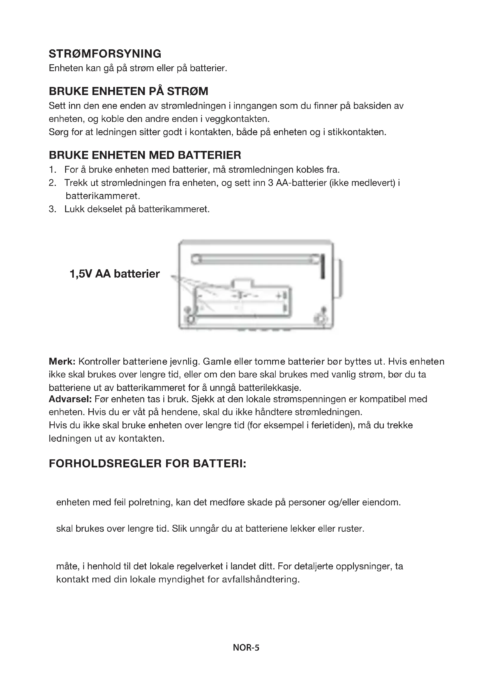 Merk: Kontroller batteriene jevnlig. Gamle eller tomme batterier bør byttes ut. Hvis enheten ikke skal brukes over lengre tid, eller om den bare skal brukes med vanlig strøm, bør du ta batteriene ut av batterikammeret for å unngå batterilekkasje. Advarsel: Før enheten tas i bruk. Sjekk at den lokale strømspenningen er kompatibel med enheten. Hvis du er våt på hendene, skal du ikke håndtere strømledningen. Hvis du ikke skal bruke enheten over lengre tid (for eksempel i ferietiden), må du trekke ledningen ut av kontakten. FORHOLDSREGLER FOR BATTERI: