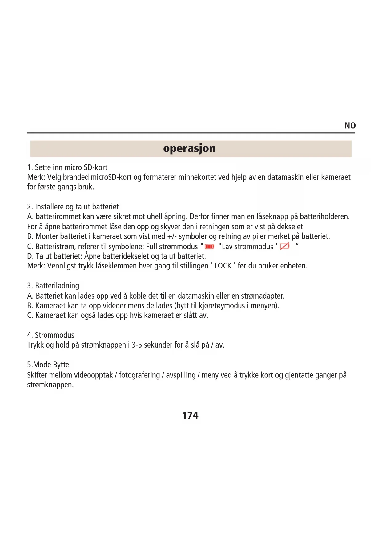 Trykk og hold på strømknappen i 3-5 sekunder for å slå på / av. 5.Mode Bytte Skifter mellom videoopptak / fotografering / avspilling / meny ved å trykke kort og gjentatte ganger på strømknappen. operasjonNO