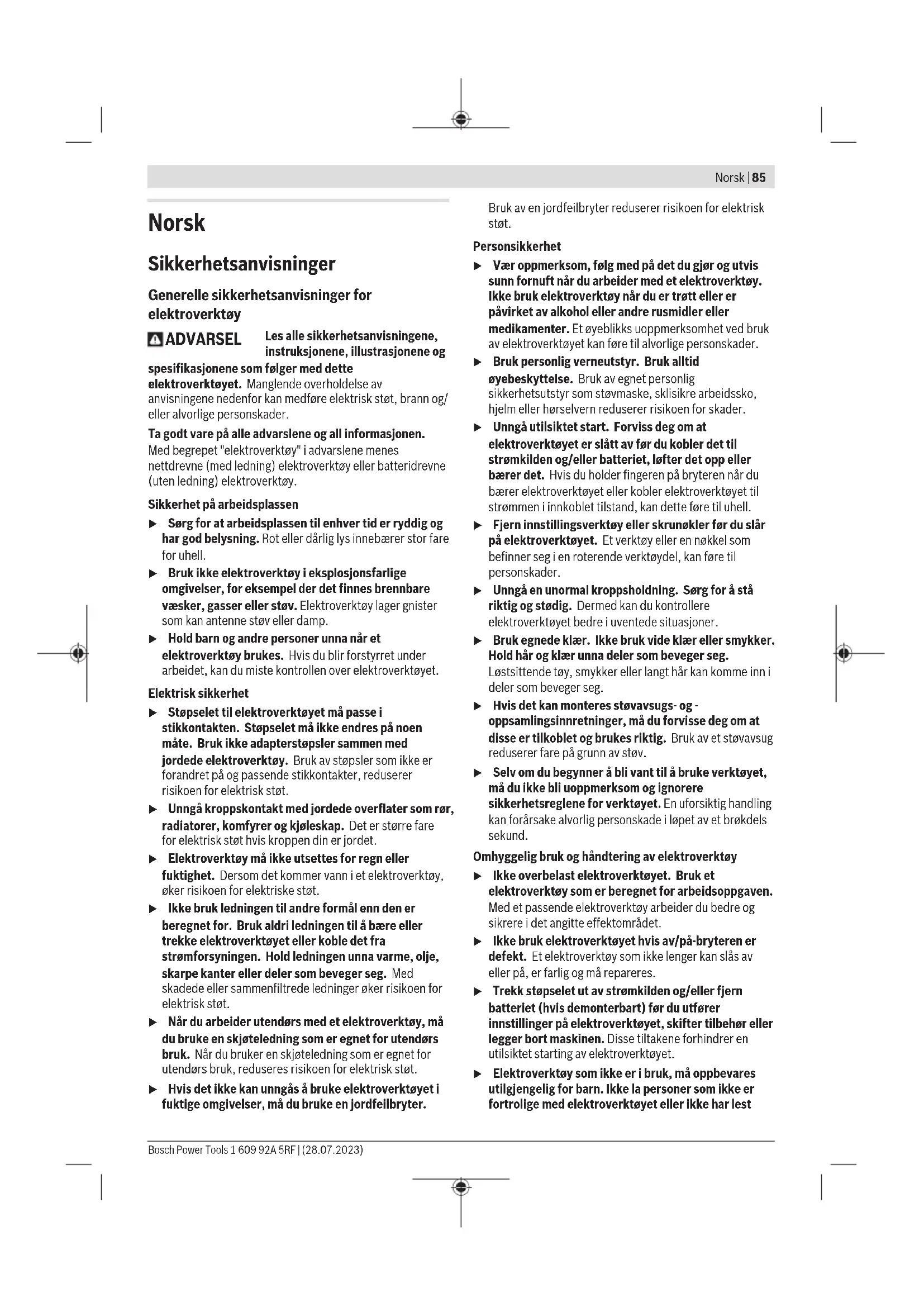 Vibrasjonsnivået og støyemisjonen som er angitt i disse anvisningene er målt i samsvar med en standardisert målemetode og kan brukes til sammenligning av elektroverktøy. Verdiene egner seg også til en foreløpig estimering av vibrasjonsnivået og støyutslippet. Angitt vibrasjonsnivå og støyutslipp representerer de hovedsakelige bruksområdene til elektroverktøyet. Men hvis elektroverktøyet brukes til andre formål, med andre innsatsverktøy eller utilstrekkelig vedlikehold, kan vibrasjonsnivået og støyutslippet avvike fra det som er angitt. Dette kan føre til en betydelig økning av vibrasjonsnivået og støyutslippet for hele arbeidstidsrommet. For en nøyaktig vurdering av vibrasjonsnivået og støyutslippet skal det også tas hensyn til de tidene verktøyet er slått av, eller går, men ikke faktisk er i bruk. Dette kan redusere vibrasjonsnivået og støyutslippet for hele arbeidstidsrommet betraktelig. Bestem ekstra sikkerhetstiltak til beskyttelse av brukeren mot vibrasjonenes virkning, som for eksempel: Vedlikehold av elektroverktøy og innsatsverktøy, holde hendene varme, organisere arbeidsforløpene. Batteri Bosch selger også batteridrevne elektroverktøy uten batteri. Det er angitt på emballasjen om et batteri følger med ditt elektroverktøy. Lade batteriet u Bruk bare laderne som er oppført i de tekniske spesifikasjonene. Kun disse laderne er tilpasset til Li- ion-batteriet som er brukt i elektroverktøyet. Merknad: I samsvar med internasjonale transportforskrifter blir litium-ion-batterier levert delvis ladet. For å sikre full effekt fra batteriet må du lade det helt opp før første gangs bruk. Sette inn batteriet Skyv det oppladede batteriet inn i batteriholderen til det låses ordentlig. Bosch Power Tools 1 609 92A 5RF | (28.07.2023)90 | Norsk Ta ut batteriet For å ta ut batteriet trykker du på utløserknappene og trekker batteriet ut. Ikke bruk makt. Indikator for batteriladenivå De tre grønne lysdiodene i batteriets ladenivåindikator viser batteriets ladenivå. Ladenivåindikatoren lyser bare i 3sekunder etter innkobling. Lysdiode Kapasitet Lyser kontinuerlig 3 × grønt 60–100% Lyser kontinuerlig 2 × grønt 30–60% Lyser kontinuerlig 1 × grønt 5–30% Blinker 1 × grønt 0–5% Temperaturavhengig overbelastningsvern Ved forskriftsmessig bruk kan ikke elektroverktøyet overbelastes. Hvis belastningen blir for stor eller batteritemperaturen ikke er i samsvar med spesifikasjonene, reduseres turtallet, eller elektroverktøyet slås av. Ved redusert turtall går ikke elektroverktøyet med fullt turtall igjen før batteriet har tillatt temperatur eller belastningen reduseres. Ved automatisk utkobling slår du av elektroverktøyet, lar batteriet avkjøles og slår på elektroverktøyet igjen. Indikator for temperaturovervåking/ overbelastningsvern Den røde LED-indikatorenhjelper deg med å beskytte batteriet mot overoppheting og motoren mot overbelastning. Hvis LED-indikatoren lyser kontinuerlig rødt, er batteritemperaturen for høy, og elektroverktøyet slås automatisk av. – Slå av elektroverktøyet. – La batteriet avkjøles før du fortsetter arbeidet. Hvis LED-indikatoren blinker rødt, er elektroverktøyet blokkert, og det slås automatisk av. Trekk elektroverktøyet ut av emnet. Når blokkeringen er fjernet, arbeider elektroverktøyet videre. Regler for optimal bruk av oppladbare batterier Beskytt batteriet mot fuktighet og vann. Batteriet må oppbevares ved temperatur fra −20°C til 50°C. Du må for eksempel ikke la det ligge i bilen om sommeren. En vesentlig kortere driftstid etter oppladingen er et tegn på at batteriet er oppbrukt og må skiftes ut. Følg anvisningene om kassering. Montering Montere verneinnretning u Ta alltid batteriet ut av elektroverktøyet før arbeider på elektroverktøyet utføres (f.eks. vedlikehold, verktøyskifte osv.) og før transport og oppbevaring. Det er fare for skader hvis du trykker på av/på-bryteren ved en feiltagelse. Merknad: Etter brudd på slipeskiven under drift eller skader på festeinnretningene på vernedekselet/elektroverktøyet må elektroverktøyet omgående sendes inn til kundeservice. Adresser se avsnittet "Kundeservice og kundeveiledning". Vernedeksel for sliping u Under sliping må du alltid bruke vernedekselet for sliping(7). Vernedeksel for kapping u Ved kapping må du alltid bruke vernedekselet for kapping(10). u Sørg for tilstrekkelig støvavsug ved kapping i stein. Montere vernedeksel (se bilde A) Sett vernedekselet for kapping (10) på vernedekselet for sliping (7) til det går helt i lås. Stille inn vernedekselet (se bilde A) Drei vernedekselet til ønsket posisjon, da det gå i lås. Det trengs ikke noe verktøy til dette. u Still inn vernedekselet (7) slik at gnistregn i retning brukeren unngås. Montere slipeverktøy u Ta alltid batteriet ut av elektroverktøyet før arbeider på elektroverktøyet utføres (f.eks. vedlikehold, verktøyskifte osv.) og før transport og oppbevaring. Det er fare for skader hvis du trykker på av/på-bryteren ved en feiltagelse. u Ikke berør slipe- og kappeskiver før de er avkjølt. Skivene blir svært varme under arbeidet. Rengjør slipespindelen (8) og all delene som skal monteres. For å stramme eller løsne slipeverktøyene skyver du spindellåseknappen (2) forover og dreier samtidig på slipeverktøyet for å låse slipespindelen. u Trykk på spindellåseknappen bare når slipespindelen er stanset. Elektroverktøyet kan ta skade hvis det velter. Slipe-/kappeskive Vær oppmerksom på målene til slipeverktøyet. Hulldiameteren må passe til festeflensen. Bruk ikke adaptere eller reduksjonsstykker. Ved bruk av diamantkappeskiver må du passe på at dreieretningspilen på diamantkappeskiven og elektroverktøyets dreieretning (se dreieretningspil på huset) stemmer overens. Monteringsrekkefølgen vises på siden med illustrasjoner. Merknad: Ved montering av bundne slipe- eller kappeskiver ved hjelp av spennskruen med skive(11) so