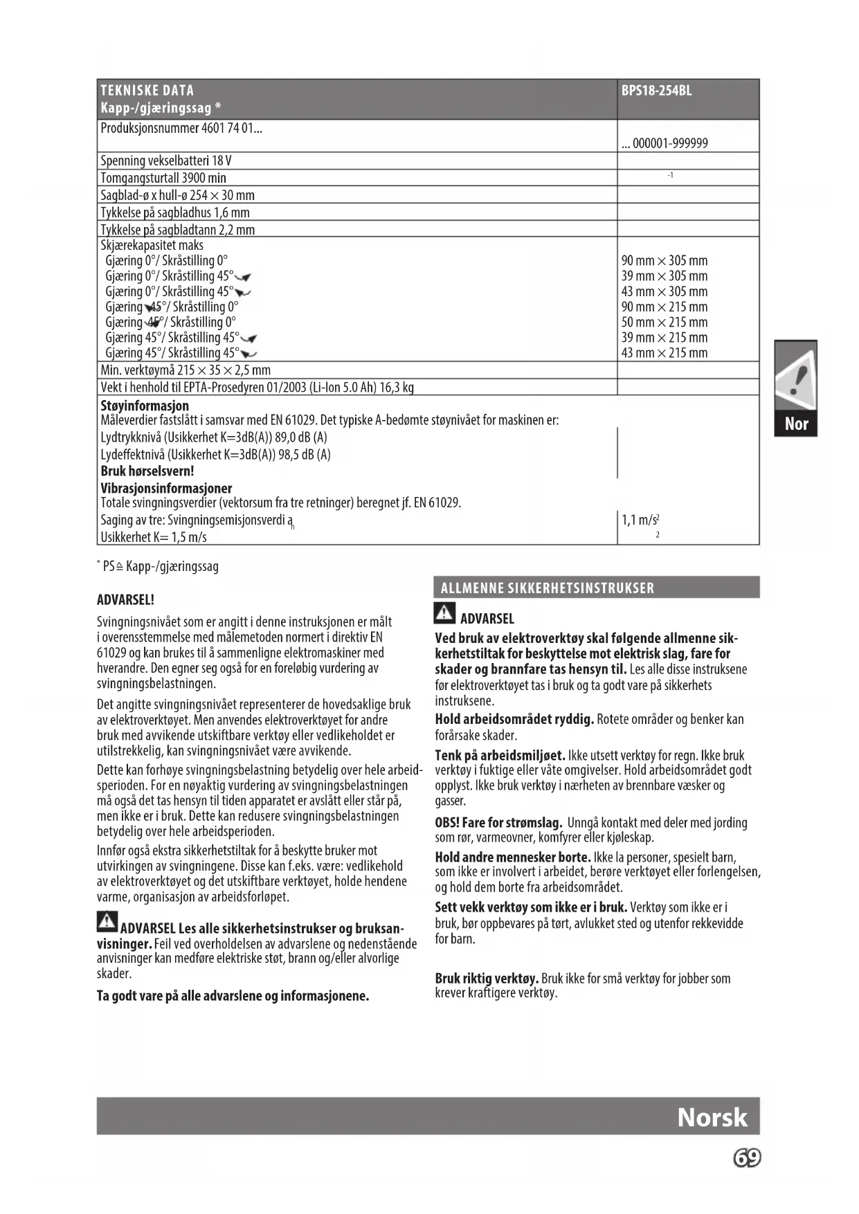 Sagblad-ø x hull-ø 254 × 30 mm Tykkelse på sagbladhus 1,6 mm Tykkelse på sagbladtann 2,2 mm Skjærekapasitet maks Gjæring 0°/ Skråstilling 0° Gjæring 0°/ Skråstilling 45° Gjæring 0°/ Skråstilling 45° Gjæring 45°/ Skråstilling 0° Gjæring 45°/ Skråstilling 0° Gjæring 45°/ Skråstilling 45° Gjæring 45°/ Skråstilling 45° 90 mm × 305 mm 39 mm × 305 mm 43 mm × 305 mm 90 mm × 215 mm 50 mm × 215 mm 39 mm × 215 mm 43 mm × 215 mm Min. verktøymå 215 × 35 × 2,5 mm Vekt i henhold til EPTA-Prosedyren 01/2003 (Li-Ion 5.0 Ah) 16,3 kg Støyinformasjon Måleverdier fastslått i samsvar med EN 61029. Det typiske A-bedømte støynivået for maskinen er: Lydtrykknivå (Usikkerhet K=3dB(A)) 89,0 dB (A) Lydeektnivå (Usikkerhet K=3dB(A)) 98,5 dB (A) Bruk hørselsvern! Vibrasjonsinformasjoner Totale svingningsverdier (vektorsum fra tre retninger) beregnet jf. EN 61029. Saging av tre: Svingningsemisjonsverdi a