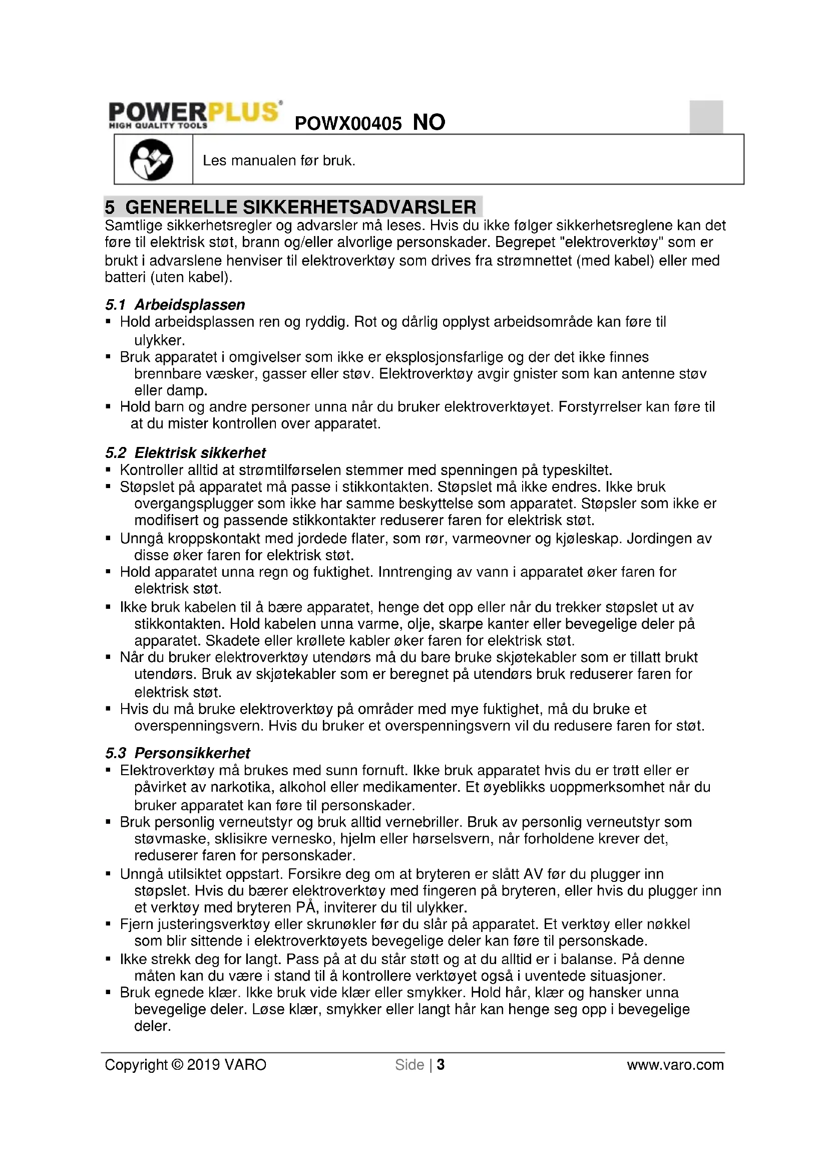 - Bruk egnede klær. Ikke bruk vide klær eller smykker. Hold hår, klær og hansker unna bevegelige deler. Løse klær, smykker eller langt hår kan henge seg opp i bevegelige deler.POWX00405 NO Copyright © 2019 VARO Side | 4 www.varo.com