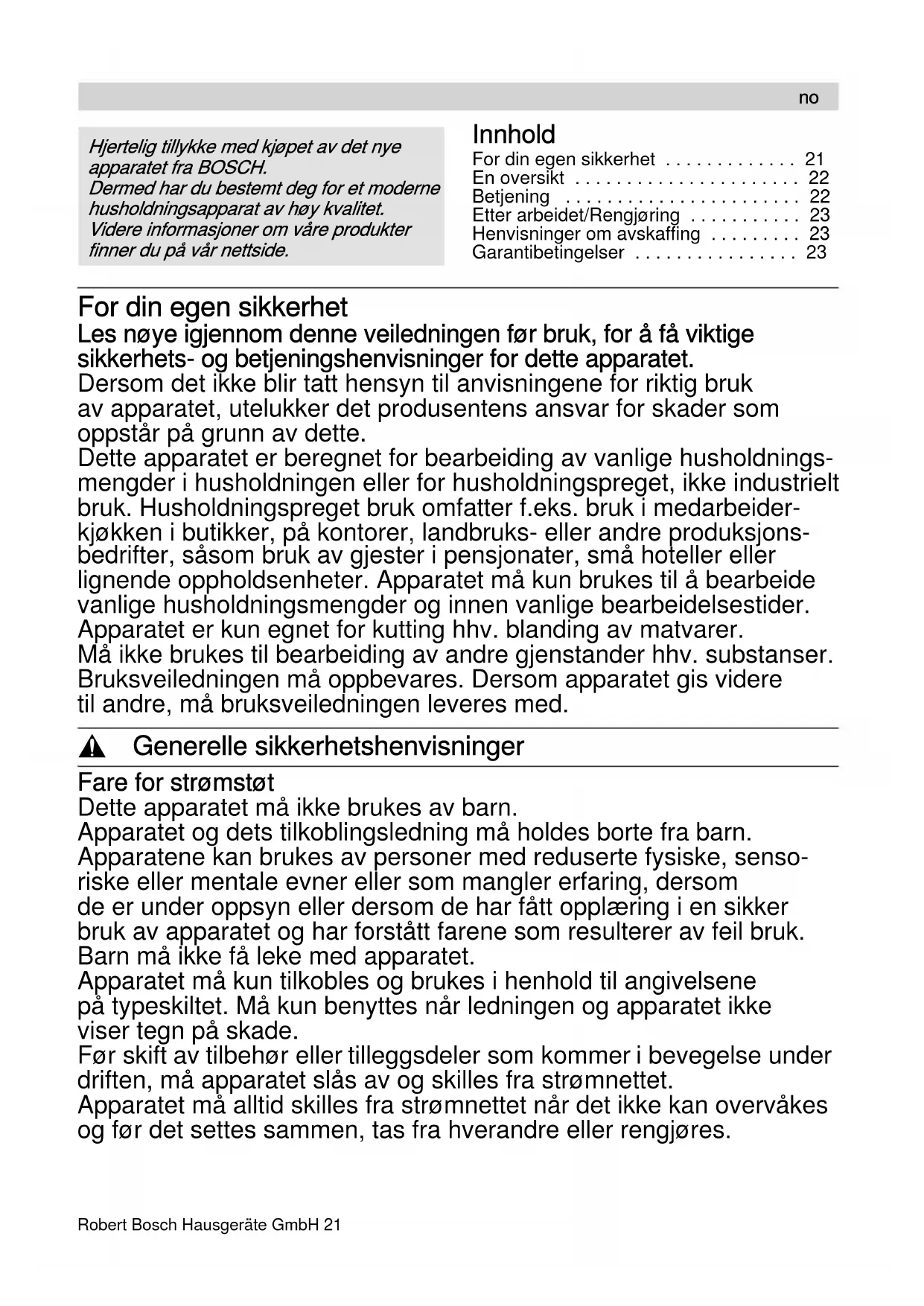 - Ændringer forbeholdes.Robert Bosch Hausgeräte GmbH 21 Innhold For din egen sikkerhet p. 21
