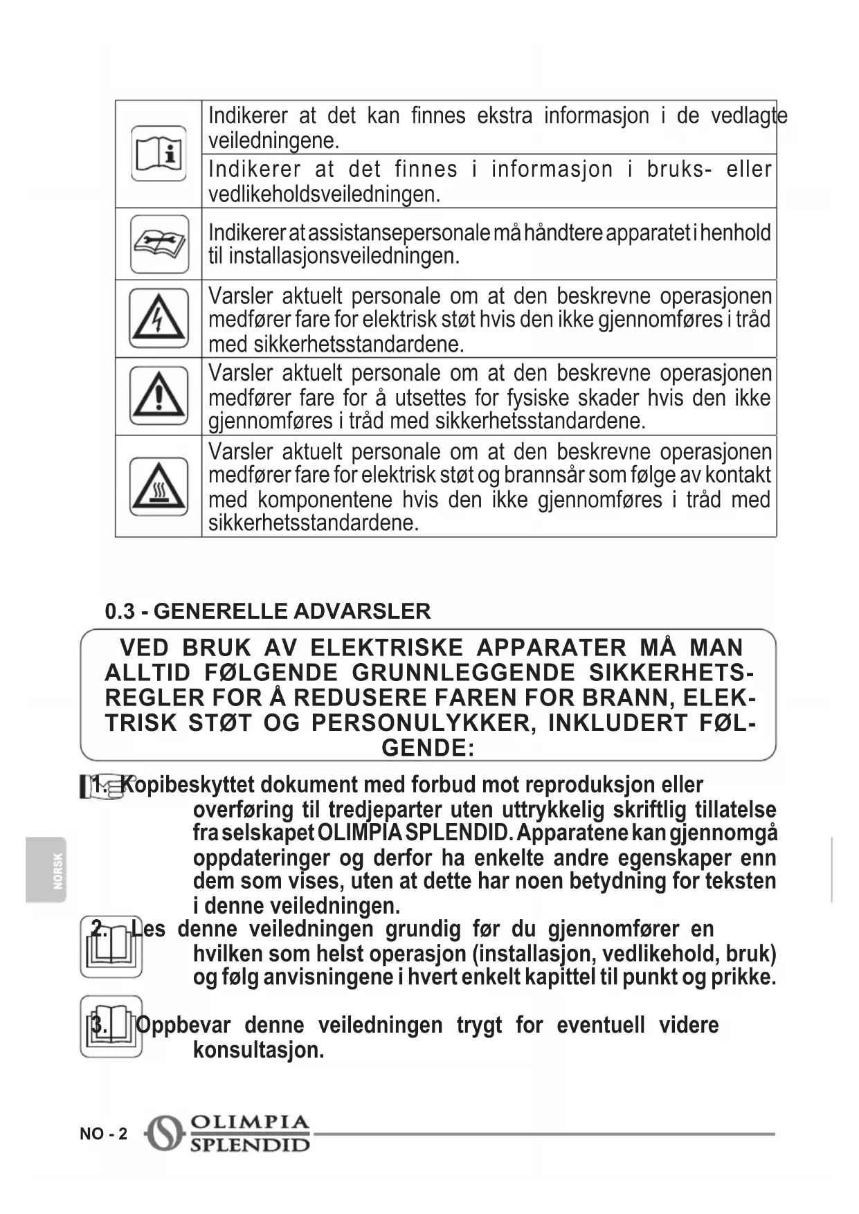 - Varsler at dette dokumentet må leses oppmerksomt før du installerer og/eller bruker apparatet. Varsler at dette dokumentet må leses oppmerksomt før alle former for vedlikehold og/eller rengjøring. GENERELL INNHOLDSFORTEGNELSE 0 - ADVARSLER p. 10