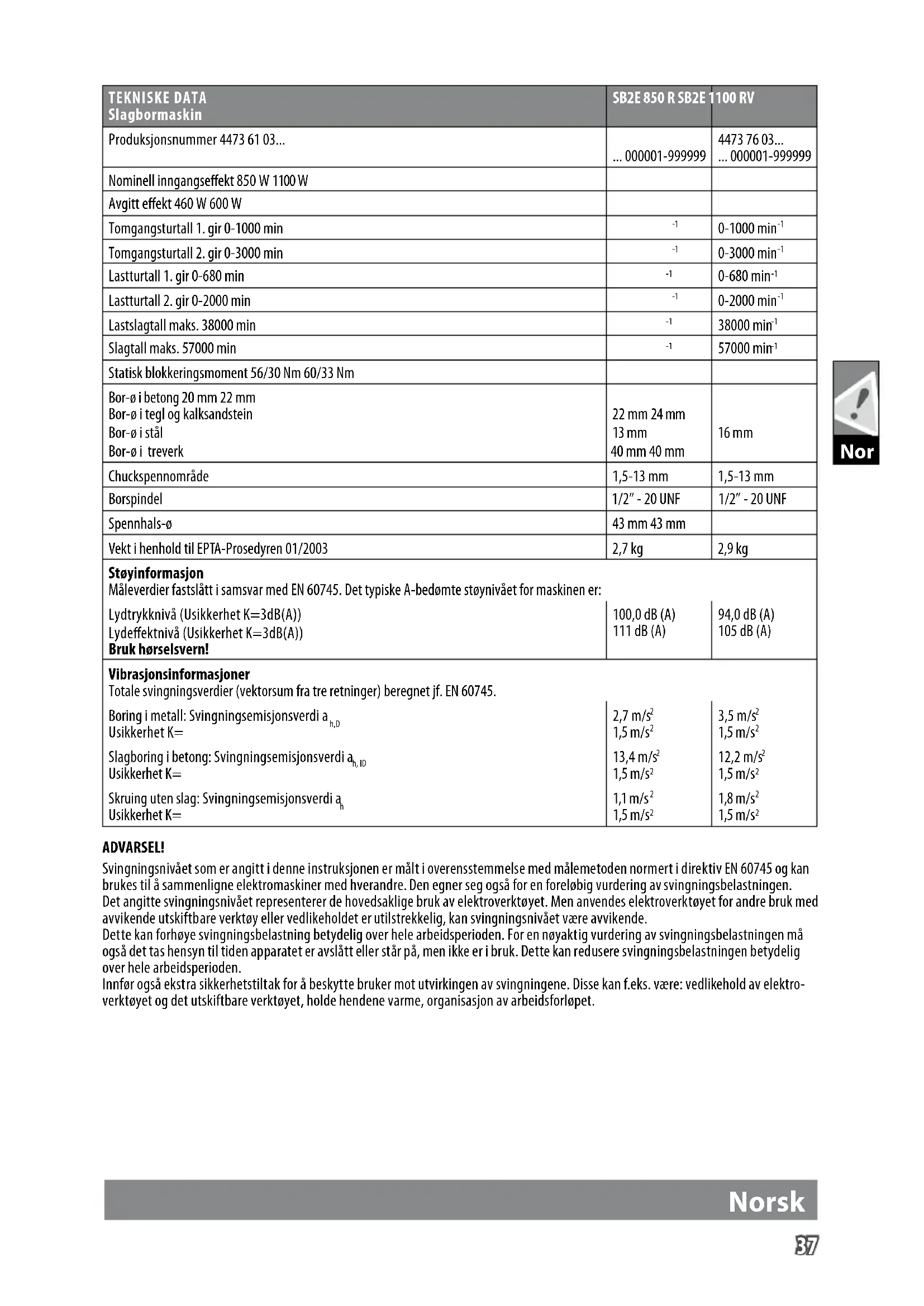 Er det skade på nettkabelen, må den skiftes av kundeservice, fordi det behøves spesialverktøy. Bruk kun AEG tilbehør og reservedeler. Komponenter der utskift- ning ikke er beskrevet skal skiftes ut hos AEG kundeservice (se brosjyre garanti/kundeserviceadresser). Ved behov kan du be om en eksplosjonstegning av apparatet hos din kundeservice eller direkte hos Techtronic Industries GmbH, Max-Eyth-Straße10, 71364Winnenden, Germany. Oppgi maskin- type og det nummeret på typeskiltet. Norsk39 English Nor SYMBOLER OBS! ADVARSEL! FARE! Trekk støpslet ut av stikkontakten før du begynner arbeider på maskinen. Les nøye gjennom bruksanvisningen før maskinen tas i bruk. Tilbehør - inngår ikke i leveransen, anbefalt komplettering fra tilbehørsprogrammet. Elektriske apparat skal ikke kastes sammen med vanlig husholdningsavfall. Elektriske og elektroniske apparat skal samles separat og leveres til miljøvennlig deponering til en avfall bedrift. Informer deg hos myndighetene på stedet eller hos din fagforhandler hvor det nnes recycling bedrifter oppsamlingssteder. Elektroverktøy av verneklasse II. Elektroverktøy hvor beskyttelse mot elektrisk slag ikke bare er avhengig av basisisoleringen, men som også er avhengig av at tilleggs vernetiltak som dobbelt eller forsterket isolering blir brukt. CE-tegn UkrSEPRO Konformitetstegn. EurAsian Konformitetstegn. Norsk40 English Sve TEKNISKA DATA Slagborrmaskin SB2E 850 R SB2E 1100 RV Produktionsnummer 4473 61 03... ... 000001-999999