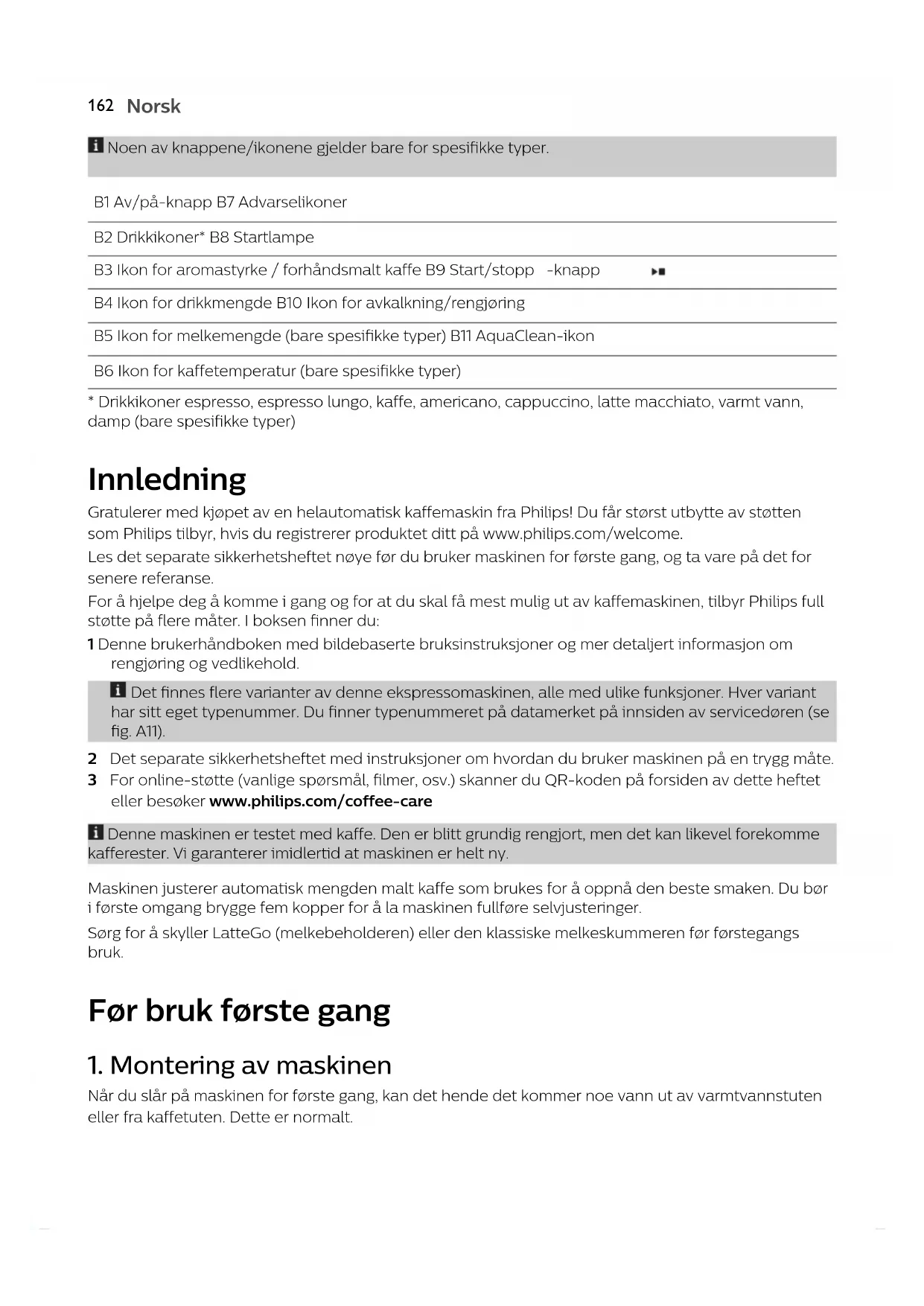 - Drikkikoner espresso, espresso lungo, kaffe, americano, cappuccino, latte macchiato, varmt vann, damp (bare spesifikke typer) Innledning Gratulerer med kjøpet av en helautomatisk kaffemaskin fra Philips! Du får størst utbytte av støtten som Philips tilbyr, hvis du registrerer produktet ditt på www.philips.com/welcome. Les det separate sikkerhetsheftet nøye før du bruker maskinen for første gang, og ta vare på det for senere referanse. For å hjelpe deg å komme i gang og for at du skal få mest mulig ut av kaffemaskinen, tilbyr Philips full støtte på flere måter. I boksen finner du: 1 Denne brukerhåndboken med bildebaserte bruksinstruksjoner og mer detaljert informasjon om rengjøring og vedlikehold. Det finnes flere varianter av denne ekspressomaskinen, alle med ulike funksjoner. Hver variant har sitt eget typenummer. Du finner typenummeret på datamerket på innsiden av servicedøren (se fig. A11). 2 Det separate sikkerhetsheftet med instruksjoner om hvordan du bruker maskinen på en trygg måte. 3 For online-støtte (vanlige spørsmål, filmer, osv.) skanner du QR-koden på forsiden av dette heftet eller besøker www.philips.com/coffee-care Denne maskinen er testet med kaffe. Den er blitt grundig rengjort, men det kan likevel forekomme kafferester. Vi garanterer imidlertid at maskinen er helt ny. Maskinen justerer automatisk mengden malt kaffe som brukes for å oppnå den beste smaken. Du bør i første omgang brygge fem kopper for å la maskinen fullføre selvjusteringer. Sørg for å skyller LatteGo (melkebeholderen) eller den klassiske melkeskummeren før førstegangs bruk. Før bruk første gang
