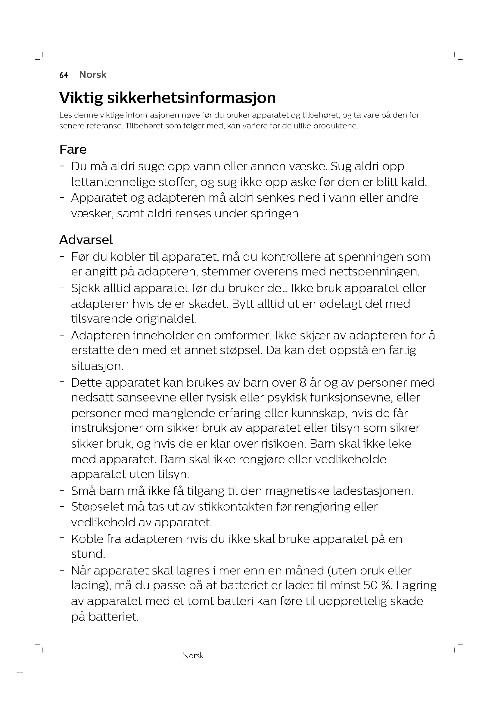 Dette apparatet kan brukes av barn over 8år og av personer med nedsatt sanseevne eller fysisk eller psykisk funksjonsevne, eller personer med manglende erfaring eller kunnskap, hvis de får instruksjoner om sikker bruk av apparatet eller tilsyn som sikrer sikker bruk, og hvis de er klar over risikoen. Barn skal ikke leke med apparatet. Barn skal ikke rengjøre eller vedlikeholde apparatet uten tilsyn.