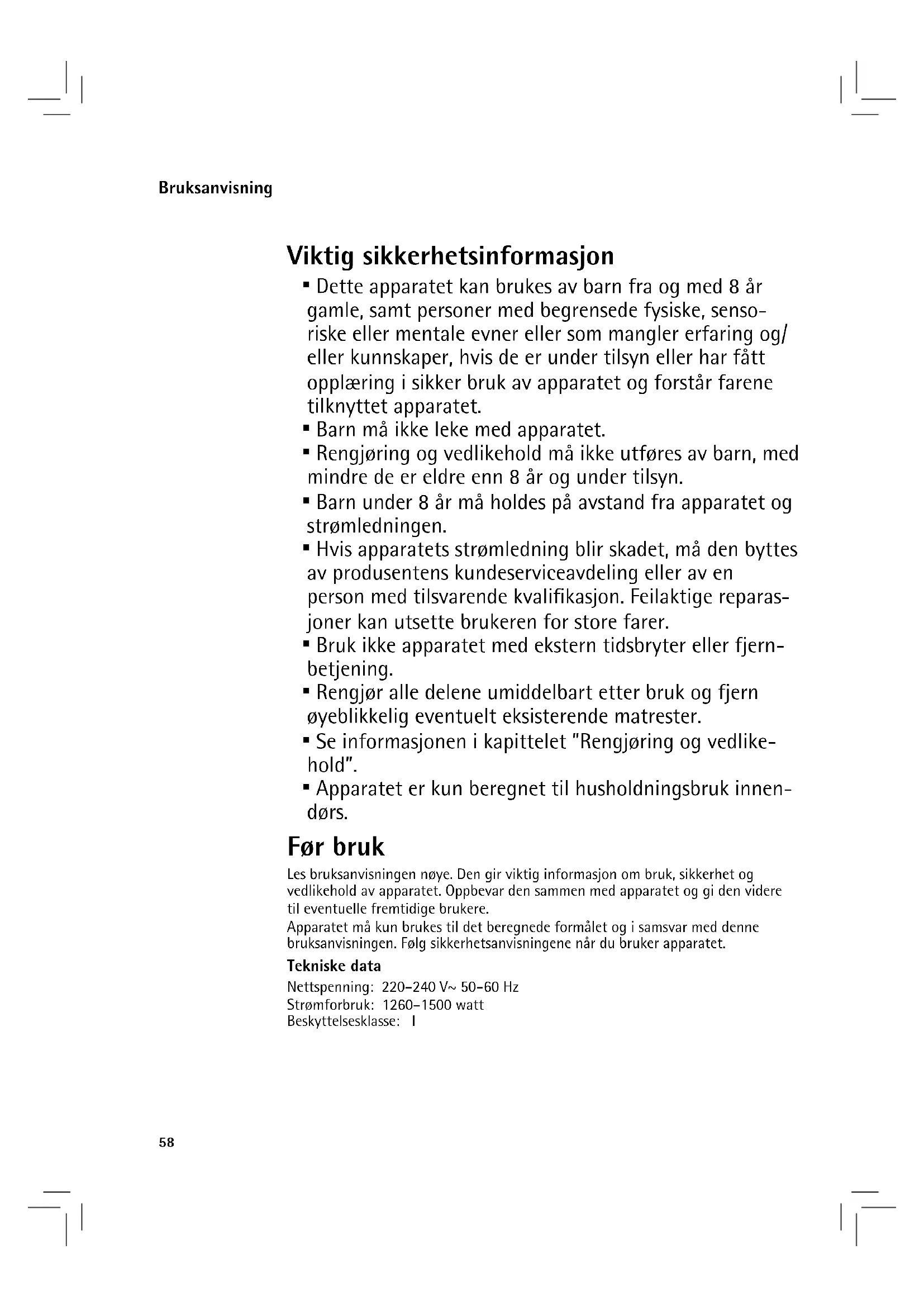 - Apparatet er kun beregnet til husholdningsbruk innen- dørs. Før bruk Les bruksanvisningen nøye. Den gir viktig informasjon om bruk, sikkerhet og vedlikehold av apparatet. Oppbevar den sammen med apparatet og gi den videre til eventuelle fremtidige brukere. Apparatet må kun brukes til det beregnede formålet og i samsvar med denne bruksanvisningen. Følg sikkerhetsanvisningene når du bruker apparatet. Tekniske data Nettspenning: 220–240 V~ 50–60 Hz Strømforbruk: 1260–1500 watt Beskyttelsesklasse: I59
