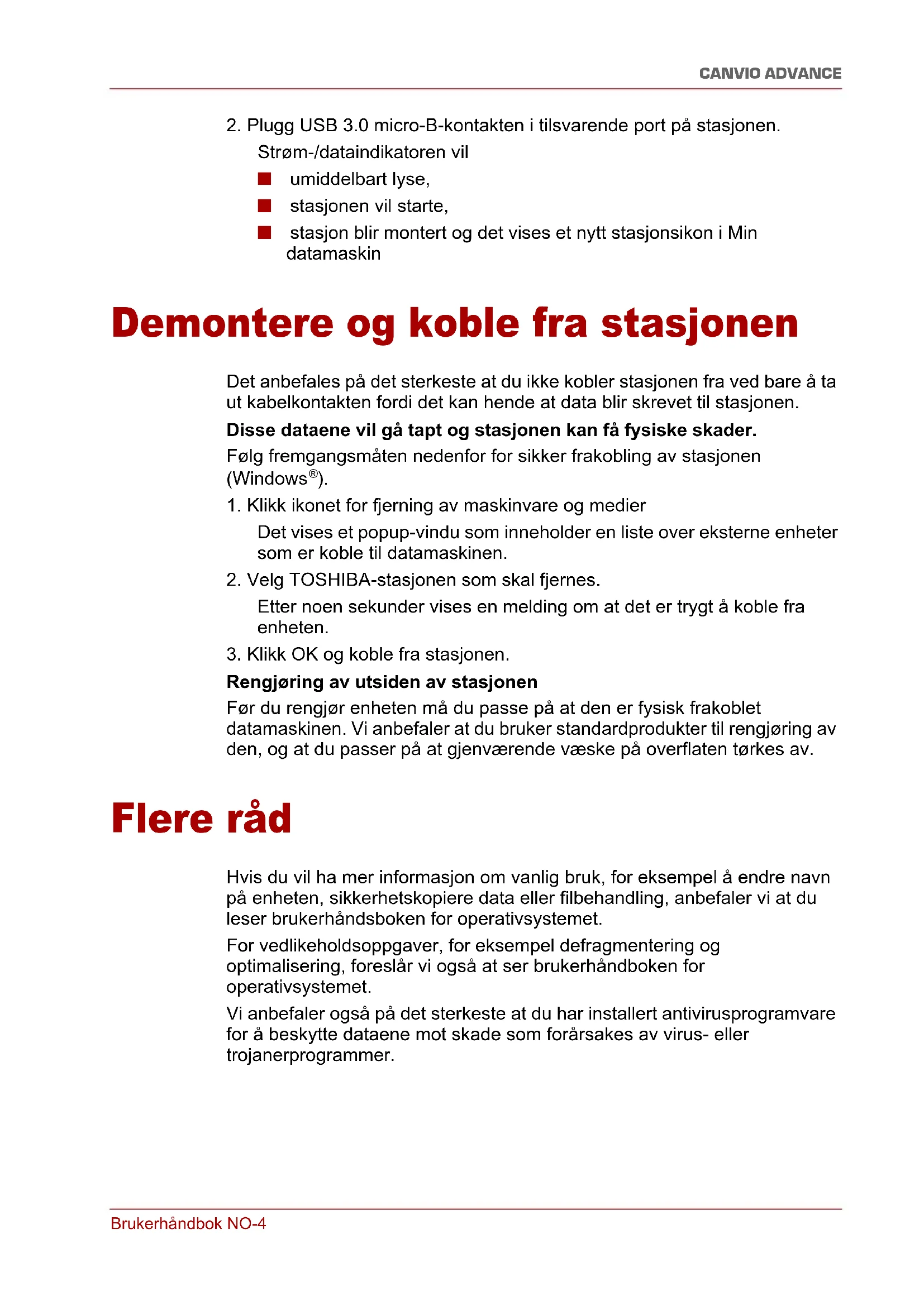 ) lavere enn den faktiske stasjonskapasiteten? A: Forskjellen skyldes forskjellige metoder for beregning av kapasiteten. Harddiskprodusenter bruker desimalsystemet, og operativsystemet bruker binærsystemet. Eksempel med desimalsystemet: 1 TB = 1 000 GB 1 GB = 1 000 MB = 1 000 000 kB = 1 000 000 000 byte Eksempel med binærsystemet: 1 GB = 1 024 MB = 1 048 576 kB = 1 073 741 824 byte Dette fører til at en 1 TB (desimal) harddisk vises i Windows som om den har bare 931 GB (binært). Q: Kan jeg bruke stasjonen til å kopiere et operativsystem fra én datamaskin til en annen? A: Nei. Du må følge installasjonsinstruksjonene fra leverandøren av operativsystemet. Det fungerer ikke å bare kopiere filene.Brukerhåndbok NO-6 CANVIO ADVANCE Feilsøking Datamaskinen gjenkjenner ikke stasjonen. ■ Kontroller at kablene er godt festet. ■ Hvis stasjonen er koblet til via en USB-hub, kontrollerer du at den har en egen strømforsyning. ■ Hvis du bruker et utvidelseskort, passer du på at det fungerer som det skal og oppdaterer programvaren/fastvare. Er det farlig hvis stasjonen føles varm når den brukes? A: Dette er vanlig og ikke farlig. Feilmeldingen Device cannot start (Kan ikke starte enheten) vises. A: Det er to mulige årsaker. Det er et strømproblem, og du må kontrollere tilkoblingene, eller stasjonen er skadet og må repareres. Stasjonen vises ikke i Min datamaskin, men den vises i Enhetsbehandling. A: Følg disse instruksjonene: