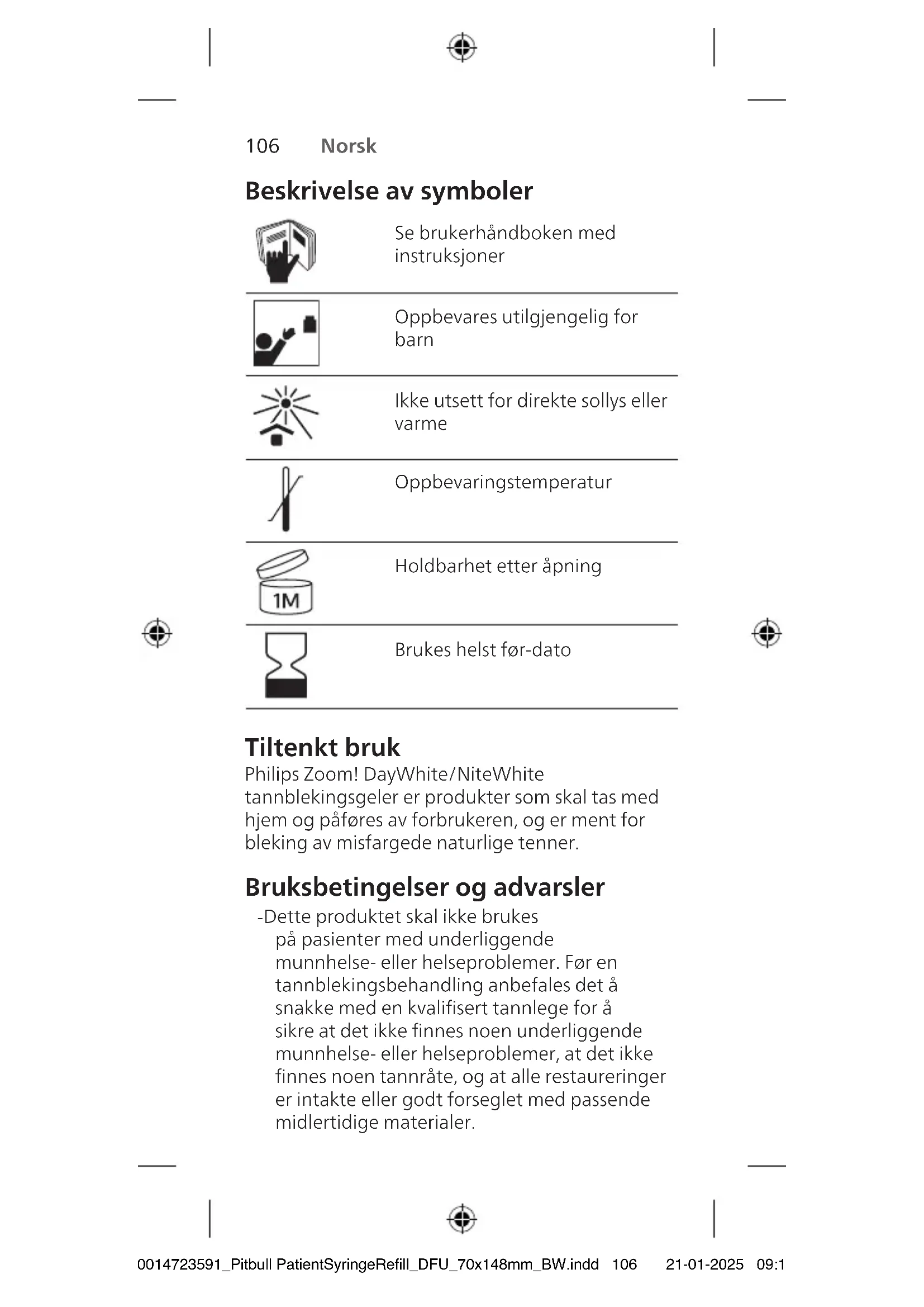 4 Fjern tuppbeskytteren fra tuppen på munnstykket. 5 Plasser en liten mengde gel i hvert tannrom i blekeskinnen. Advarsel: Ikke overfyll skinnen med gel, ettersom dette kan forårsake tannkjøttirritasjon når overødig gel blir skjøvet ut av skinnene og ned på tannkjøttet. Blekeskinnen er utformet for å passe godt på tennene. Merk: Geldråpen vist på bildet representerer den gjennomsnittlige størrelsesreduksjon for hvert tannrom, avhengig av størrelsen på tennene. Blekegelen absorberes inn i tannen og bleker fra innsiden, så det er ikke viktig å dekke hele tannen med blekegelen. Hver 2,4ml-sprøyte inneholder nok gel for 3 påføringer (ved bruk av både topp- og bunnskinner). 6 Sett blekeskinnen med gel i munnen. Pass på at du ikke presser gel ut av blekeskinnen når du setter den inn. Bobling i blekeskinnene er normalt. - Vær ekstra forsiktig for å unngå å få gel på tannkjøttet. Fjern overødig gel med en bomullspinne eller en tørr tannbørste. 300014723591_Pitbull PatientSyringeRefill_DFU_70x148mm_BW.indd 110300014723591_Pitbull PatientSyringeRefill_DFU_70x148mm_BW.indd 110 21-01-2025 09:1121-01-2025 09:11110 Norsk Norsk 111 - Selv om de este brukere vil oppnå optimale resultater innen 1–2 uker, kan du diskutere fortsatt bruk med tannlegen din hvis du ikke er fornøyd med resultatene. Ikke bruk i mer enn 2uker uten å kontakte tannlegen din først. - Tannområdet nærmest tannkjøttet kan blekes saktere enn bitekanten. Dette området vil forbli den mørkeste delen av tannen. - Tannbleking kan føre til midlertidig dehydrering av tennene, som fører til hvite ekker eller striper. Ujevnheter i blekingen vil normalt forsvinne innen 2–7 dager etter bruk av tannblekingsproduktet. Optimal farge oppnås innen 2 uker. Påføringsinstrukser Gå gjennom produktets bruksanvisning med tannlegen din, og be om en demonstrasjon av hvordan du bruker blekingsgelen riktig. 1 Bruk tanntråd og børst tennene. 2 Fjern den beskyttende hetten fra sprøyten ved å vri den mot klokken og dra den av.
