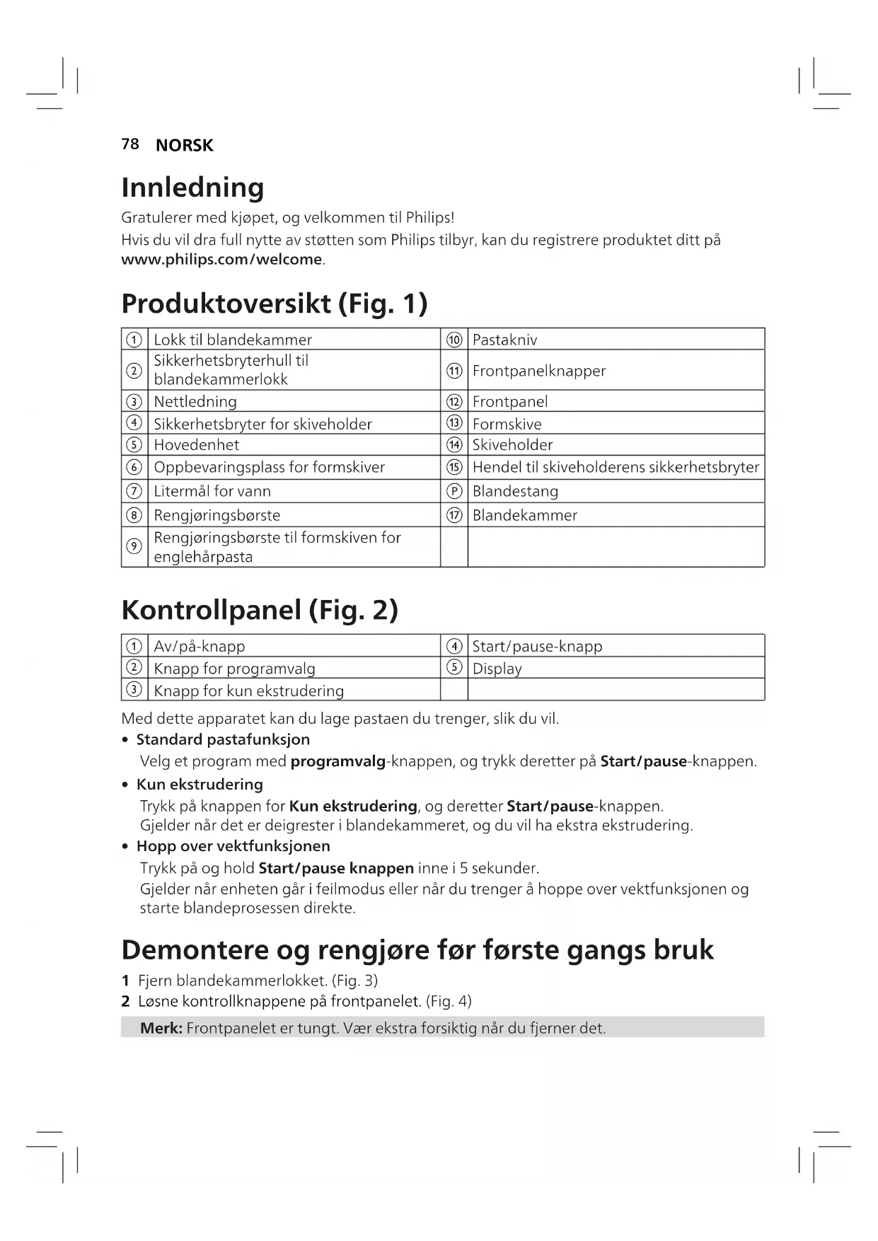 - Hopp over vektfunksjonen Trykk på og hold Start/pause knappen inne i 5sekunder. Gjelder når enheten går i feilmodus eller når du trenger å hoppe over vektfunksjonen og starte blandeprosessen direkte. Demontere og rengjøre før første gangs bruk 1 Fjern blandekammerlokket. (Fig.3) 2 Løsne kontrollknappene på frontpanelet. (Fig.4) Merk: Frontpanelet er tungt. Vær ekstra forsiktig når du fjerner det.79 NORSK 3 Demonter frontpanelet, formskiven, formskiveholderen, blandestaven og blandekammeret i anvist rekkefølge. (Fig.5) 4 Rengjør alle avtakbare deler, og tørk dem. (Fig.6). 5 Trekk ut oppbevaringsskuen for formskiven, og rengjør alle skiver og rengjøringsverktøy. (Fig.7) Montering 1 Skyv blandekammeret inn i apparatet. (Fig.8) 2 Plasser blandestangen mot hullet i hovedenheten. Sett blandestangen helt inn i hovedenheten. (Fig.9) 3 Fest skiveholderen på apparatet. (Fig.10) 4 Sett formskiven på skiveholderen, og kontroller at den sitter ordentlig fast på skiveholderen. (Fig.11) Merk: Kontroller at det indre hulrommet i formskiven og skiveholderen er montert på riktig måte. (Fig.12) 5 Fest frontpanelet til hovedenheten. (Fig.13) Merk: Frontpanelet er tungt. Vær ekstra forsiktig når du monterer det. 6 Fest frontpanelets kontrollbrytere. (Fig.14) Merk: y Dersom frontpanelet eller formskiven ikke er riktig montert, vil sikkerhetsbryteren forhindre at apparatet fungerer. y Kontroller at frontpanelet er festet godt før du bruker apparatet. 7 Lukk blandekammerlokket ordentlig. (Fig. 21) Bruke pastamaskinen Start forberedelsen 1 Sett støpselet inn i stikkontakten. Pastamaskinen gir fra seg en lyd én gang, og alle indikatorene blinker én gang. (Fig.15) Merk: Kontroller at alle delene er riktig montert før du setter i støpselet. 2 Trykk på av/på-knappen for å slå på apparatet. (Fig.16) 3 Velg pastatype med programvalg-knappen. (Fig.17) Tips: y Hvis du tilbereder en oppskrift med egg og vann, kakker du egget og legger hele i litermålet for vann, og fyller det opp med vann til du når den nødvendige mengden. y I stedet for vann kan du også bruke grønnsaksjuice (f.eks. spinatjuice, rødbetjuice osv.).80 NORSK Program Tips Valgfri oppskrift Vanlig pasta/nudler • Pasta med bare mel og vann