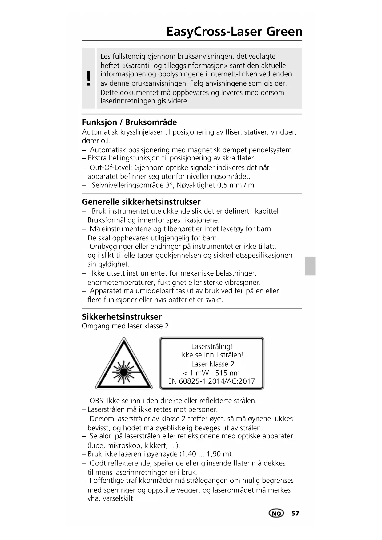 Funksjon / Bruksområde Automatisk krysslinjelaser til posisjonering av iser, stativer, vinduer, dører o.l. – Automatisk posisjonering med magnetisk dempet pendelsystem – Ekstra hellingsfunksjon til posisjonering av skrå ater – Out-Of-Level: Gjennom optiske signaler indikeres det når apparatet benner seg utenfor nivelleringsområdet. – Selvnivelleringsområde 3°, Nøyaktighet 0,5 mm / m – OBS: Ikke se inn i den direkte eller reekterte strålen. – Laserstrålen må ikke rettes mot personer. – Dersom laserstråler av klasse 2 treffer øyet, så må øynene lukkes bevisst, og hodet må øyeblikkelig beveges ut av strålen. – Se aldri på laserstrålen eller reeksjonene med optiske apparater (lupe, mikroskop, kikkert, ...). – Bruk ikke laseren i øyehøyde (1,40 ... 1,90 m). – Godt reekterende, speilende eller glinsende ater må dekkes til mens laserinnretninger er i bruk. – I offentlige trakkområder må strålegangen om mulig begrenses med sperringer og oppstilte vegger, og laserområdet må merkes vha. varselskilt. Laserstråling! Ikke se inn i strålen! Laser klasse 2 < 1 mW · 515 nm EN 60825-1:2014/AC:2017 Sikkerhetsinstrukser Omgang med laser klasse 2 Generelle sikkerhetsinstrukser – Bruk instrumentet utelukkende slik det er denert i kapittel Bruksformål og innenfor spesikasjonene. – Måleinstrumentene og tilbehøret er intet leketøy for barn. De skal oppbevares utilgjengelig for barn. – Ombygginger eller endringer på instrumentet er ikke tillatt, og i slikt tilfelle taper godkjennelsen og sikkerhetsspesikasjonen sin gyldighet. – Ikke utsett instrumentet for mekaniske belastninger, enormetemperaturer, fuktighet eller sterke vibrasjoner. – Apparatet må umiddelbart tas ut av bruk ved feil på en eller ere funksjoner eller hvis batteriet er svakt. Les fullstendig gjennom bruksanvisningen, det vedlagte heftet «Garanti- og tilleggsinformasjon» samt den aktuelle informa sjonen og opplysningene i internett-linken ved enden av denne bruksanvisningen. Følg anvisningene som gis der. Dette dokumentet må oppbevares og leveres med dersom laserinnretningen gis videre. !58 Til transport må alltid alle lasere slås av, og pendelen må blokkeres, skyv skyvebryteren (3) mot høyre.