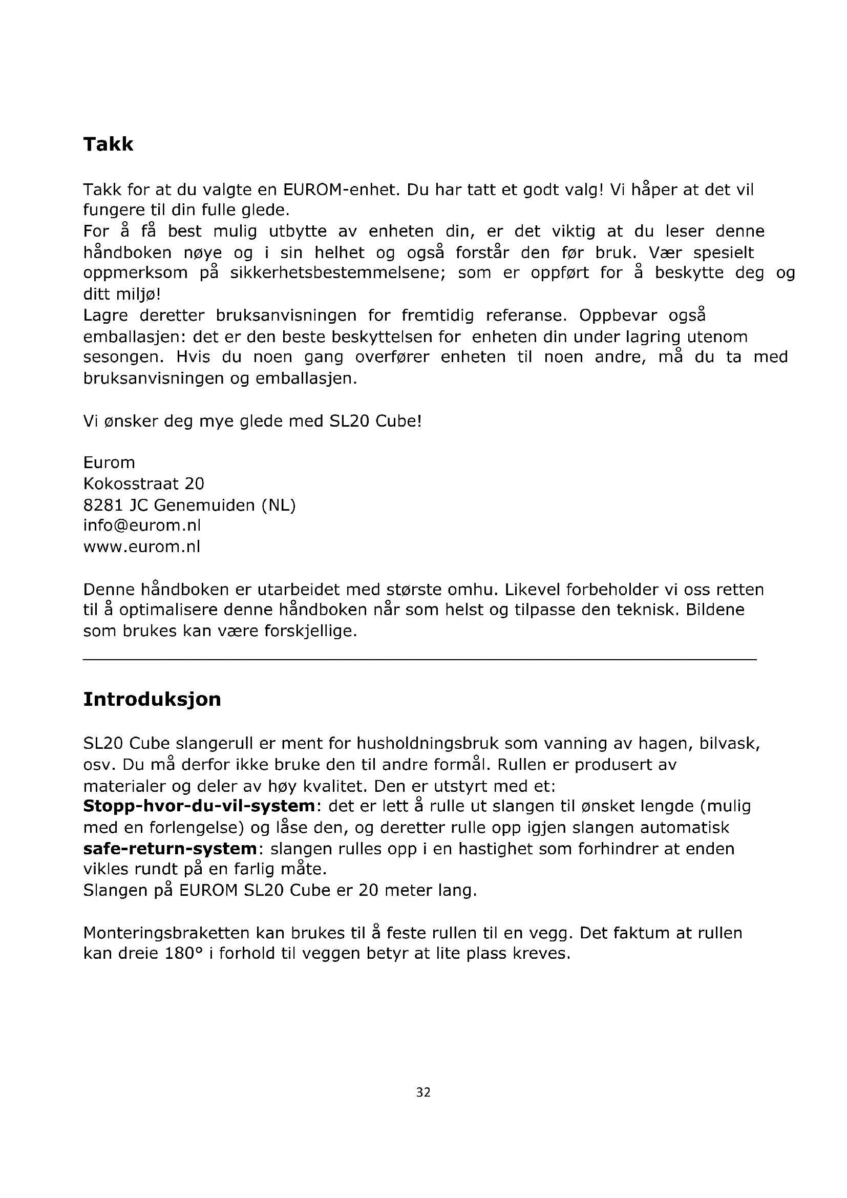 Introduksjon SL20 Cube slangerull er ment for husholdningsbruk som vanning av hagen, bilvask, osv. Du må derfor ikke bruke den til andre formål. Rullen er produsert av materialer og deler av høy kvalitet. Den er utstyrt med et: Stopp-hvor-du-vil-system: det er lett å rulle ut slangen til ønsket lengde (mulig med en forlengelse) og låse den, og deretter rulle opp igjen slangen automatisk safe-return-system: slangen rulles opp i en hastighet som forhindrer at enden vikles rundt på en farlig måte. Slangen på EUROM SL20 Cube er 20 meter lang. Monteringsbraketten kan brukes til å feste rullen til en vegg. Det faktum at rullen kan dreie 180° i forhold til veggen betyr at lite plass kreves.33