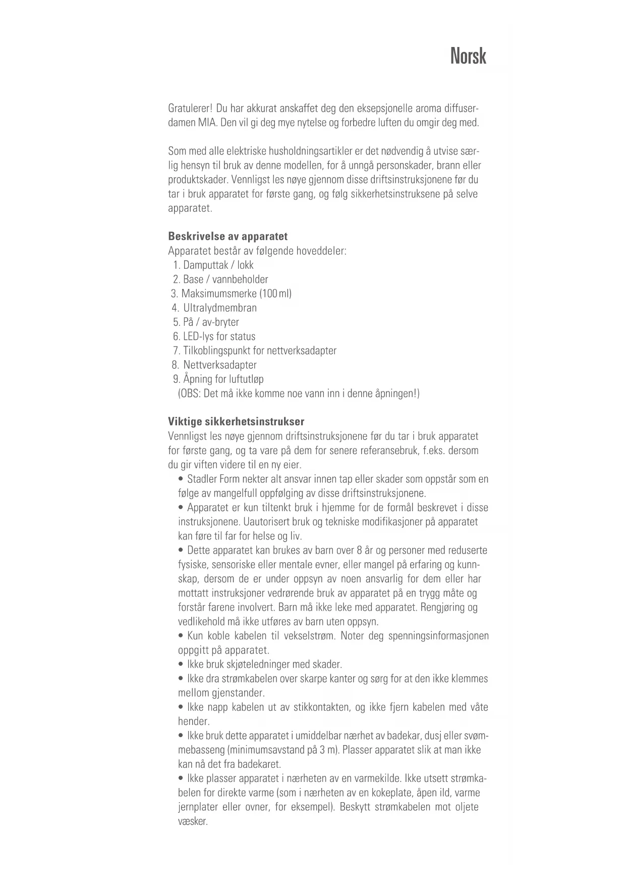 Mia - Aromadiffuser STADLER FORM - Gratis bruksanvisning og manual
