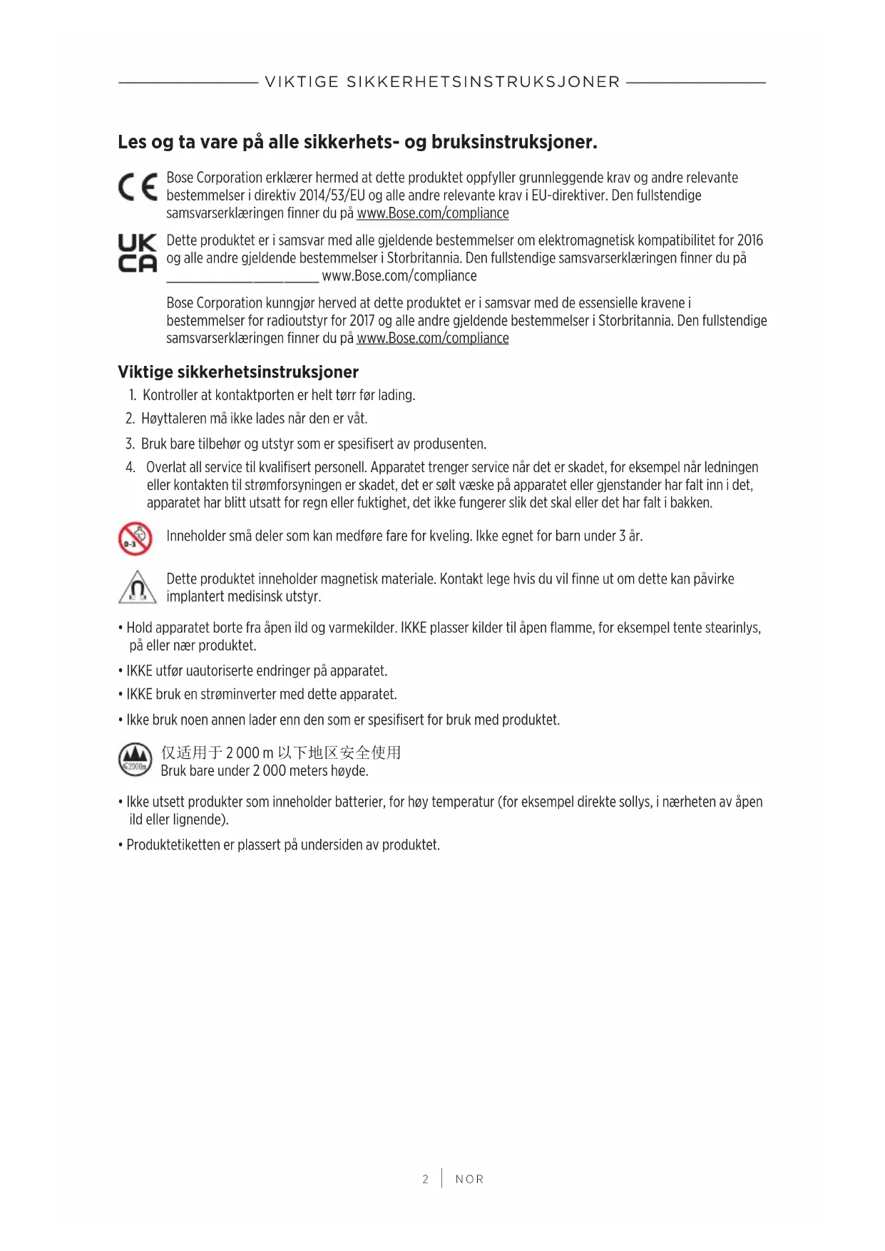 NOR Les og ta vare på alle sikkerhets- og bruksinstruksjoner. Bose Corporation erklærer hermed at dette produktet oppfyller grunnleggende krav og andre relevante bestemmelser i direktiv 2014/53/EU og alle andre relevante krav i EU-direktiver. Den fullstendige samsvarserklæringen finner du på www.Bose.com/compliancewww.Bose.com/compliance Dette produktet er i samsvar med alle gjeldende bestemmelser om elektromagnetisk kompatibilitet for 2016 og alle andre gjeldende bestemmelser i Storbritannia. Den fullstendige samsvarserklæringen finner du på www.Bose.com/compliancewww.Bose.com/compliance Bose Corporation kunngjør herved at dette produktet er i samsvar med de essensielle kravene i bestemmelser for radioutstyr for 2017 og alle andre gjeldende bestemmelser i Storbritannia. Den fullstendige samsvarserklæringen finner du på www.Bose.com/compliancewww.Bose.com/compliance Viktige sikkerhetsinstruksjoner