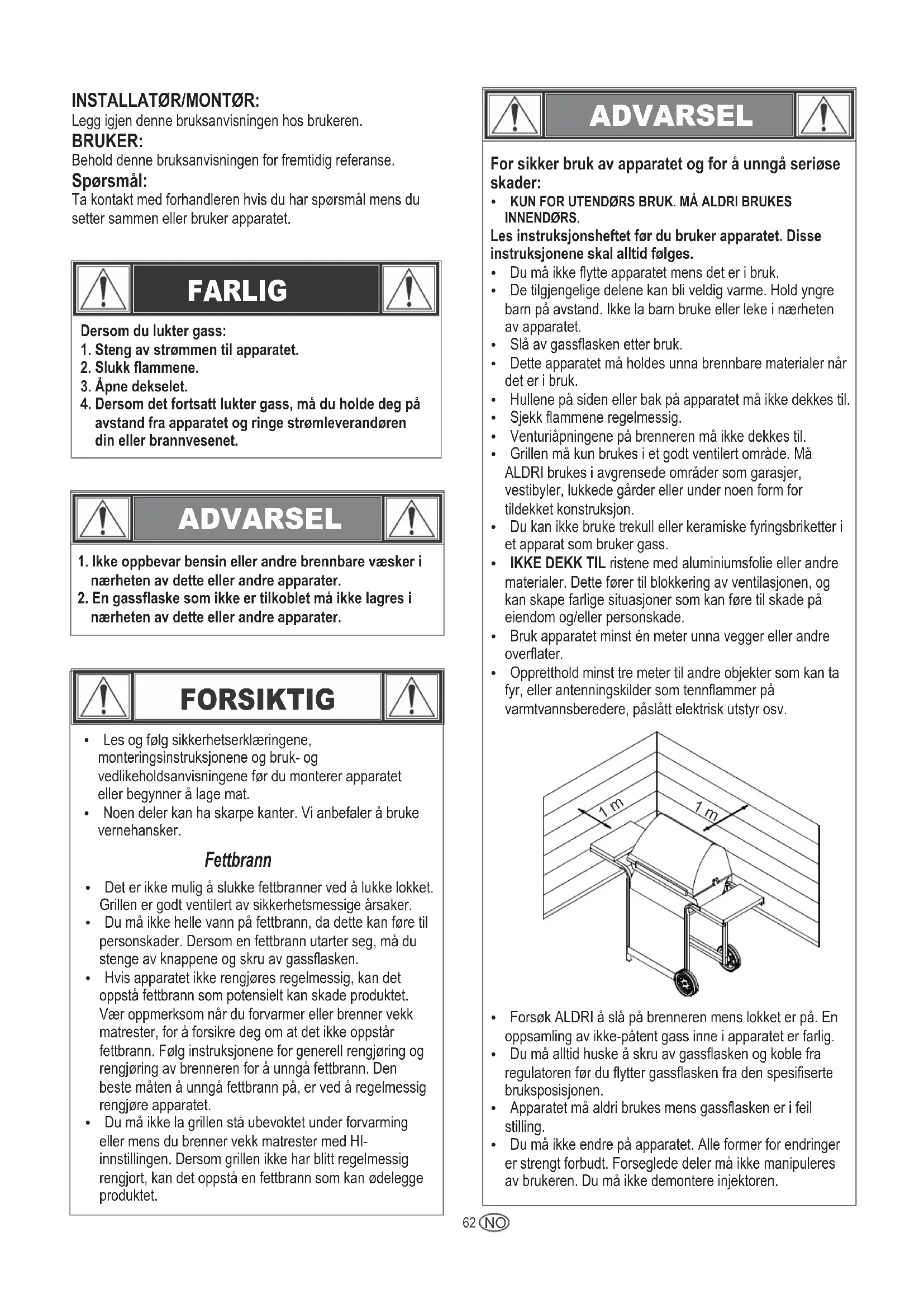 #18 #18 1,5 VDC batteri 1,5 VDC batteri 1,5 VDC batteri 6,15 kW (448 g/h) 5,28 kW (384,2 g/h) 6,15 kW (448 g/h) 6,15 kW (448 g/h)62 INSTALLATØR/MONTØR: Legg igjen denne bruksanvisningen hos brukeren. BRUKER: Behold denne bruksanvisningen for fremtidig referanse. Spørsmål: Ta kontakt med forhandleren hvis du har spørsmål mens du setter sammen eller bruker apparatet. FARLIG ADVARSEL Dersom du lukter gass:1. Steng av strømmen til apparatet.2. Slukk flammene.3. Åpne dekselet.4. Dersom det fortsatt lukter gass, må du holde deg påavstand fra apparatet og ringe strømleverandørendin eller brannvesenet.1. Ikke oppbevar bensin eller andre brennbare væsker inærheten av dette eller andre apparater.2. En gassflaske som ikke er tilkoblet må ikke lagres inærheten av dette eller andre apparater. FORSIKTIG Ÿ Les og følg sikkerhetserklæringene,monteringsinstruksjonene og bruk- ogvedlikeholdsanvisningene før du monterer apparateteller begynner å lage mat.Ÿ Noen deler kan ha skarpe kanter. Vi anbefaler å brukevernehansker. Fettbrann Ÿ Det er ikke mulig å slukke fettbranner ved å lukke lokket.Grillen er godt ventilert av sikkerhetsmessige årsaker.Ÿ Du må ikke helle vann på fettbrann, da dette kan føre tilpersonskader. Dersom en fettbrann utarter seg, må dustenge av knappene og skru av gassflasken.Ÿ Hvis apparatet ikke rengjøres regelmessig, kan detoppstå fettbrann som potensielt kan skade produktet.Vær oppmerksom når du forvarmer eller brenner vekkmatrester, for å forsikre deg om at det ikke oppstårfettbrann. Følg instruksjonene for generell rengjøring ogrengjøring av brenneren for å unngå fettbrann. Denbeste måten å unngå fettbrann på, er ved å regelmessigrengjøre apparatet.Ÿ Du må ikke la grillen stå ubevoktet under forvarmingeller mens du brenner vekk matrester med HI-innstillingen. Dersom grillen ikke har blitt regelmessigrengjort, kan det oppstå en fettbrann som kan ødeleggeproduktet. ADVARSEL For sikker bruk av apparatet og for å unngå seriøse skader: Ÿ KUN FOR UTENDØRS BRUK. MÅ ALDRI BRUKESINNENDØRS.Les instruksjonsheftet før du bruker apparatet. Disse instruksjonene skal alltid følges.Ÿ Du må ikke flytte apparatet mens det er i bruk.Ÿ De tilgjengelige delene kan bli veldig varme. Hold yngrebarn på avstand. Ikke la barn bruke eller leke i nærhetenav apparatet.Ÿ Slå av gassflasken etter bruk.Ÿ Dette apparatet må holdes unna brennbare materialer nårdet er i bruk.Ÿ Hullene på siden eller bak på apparatet må ikke dekkes til.Ÿ Sjekk flammene regelmessig.Ÿ Venturiåpningene på brenneren må ikke dekkes til.Ÿ Grillen må kun brukes i et godt ventilert område. MåALDRI brukes i avgrensede områder som garasjer,vestibyler, lukkede gårder eller under noen form fortildekket konstruksjon.Ÿ Du kan ikke bruke trekull eller keramiske fyringsbriketter iet apparat som bruker gass.Ÿ IKKE DEKK TIL ristene med aluminiumsfolie eller andrematerialer. Dette fører til blokkering av ventilasjonen, ogkan skape farlige situasjoner som kan føre til skade påeiendom og/eller personskade.Ÿ Bruk apparatet minst én meter unna vegger eller andreoverflater.Ÿ Oppretthold minst tre meter til andre objekter som kan tafyr, eller antenningskilder som tennflammer på varmtvannsberedere, påslått elektrisk utstyr osv.Ÿ Forsøk ALDRI å slå på brenneren mens lokket er på. Enoppsamling av ikke-påtent gass inne i apparatet er farlig.Ÿ Du må alltid huske å skru av gassflasken og koble fraregulatoren før du flytter gassflasken fra den spesifisertebruksposisjonen.Ÿ Apparatet må aldri brukes mens gassflasken er i feilstilling.Ÿ Du må ikke endre på apparatet. Alle former for endringerer strengt forbudt. Forseglede deler må ikke manipuleresav brukeren. Du må ikke demontere injektoren.