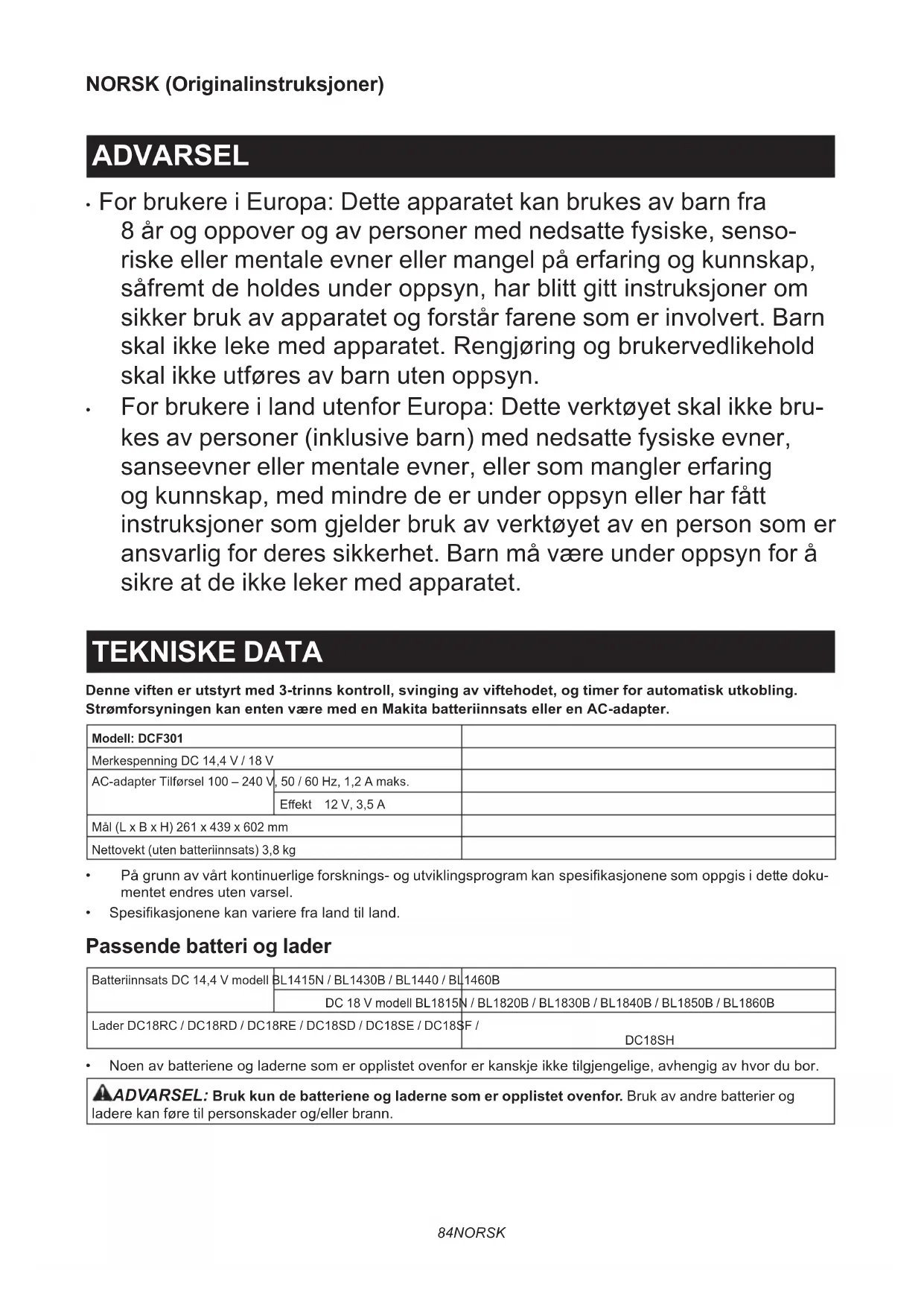 - For brukere i land utenfor Europa: Dette verktøyet skal ikke bru- kes av personer (inklusive barn) med nedsatte fysiske evner, sanseevner eller mentale evner, eller som mangler erfaring og kunnskap, med mindre de er under oppsyn eller har fått instruksjonersomgjelderbrukavverktøyetavenpersonsomer ansvarlig for deres sikkerhet. Barn må være under oppsyn for å sikre at de ikke leker med apparatet. TEKNISKE DATA Denne viften er utstyrt med 3-trinns kontroll, svinging av viftehodet, og timer for automatisk utkobling. Strømforsyningen kan enten være med en Makita batteriinnsats eller en AC-adapter. Modell: DCF301Merkespenning DC 14,4 V / 18 VAC-adapter Tilførsel 100 – 240 V, 50 / 60 Hz, 1,2 A maks.Eekt 12 V, 3,5 AMål (L x B x H) 261 x 439 x 602 mmNettovekt (uten batteriinnsats) 3,8 kg