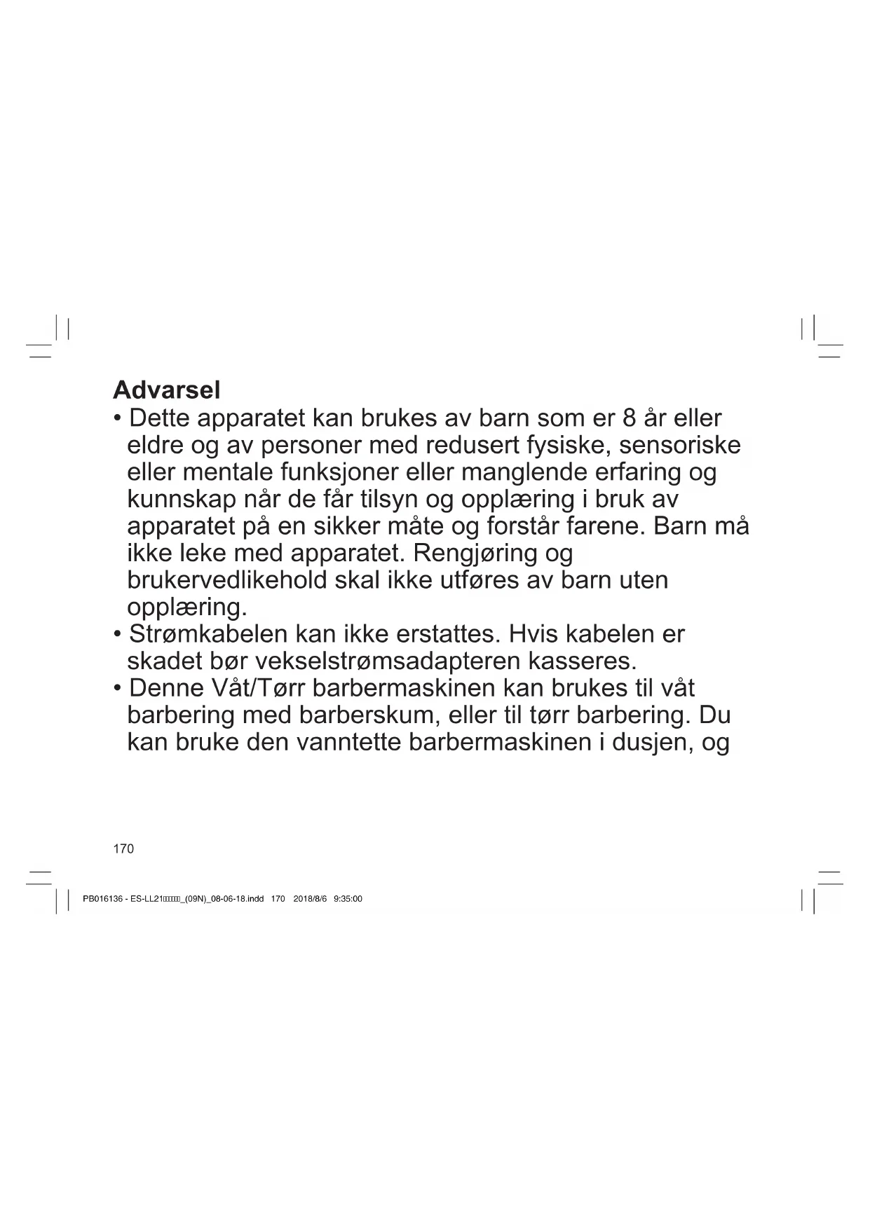 - Denne Våt/Tørr barbermaskinen kan brukes til våt barbering med barberskum, eller til tørr barbering. Du kan bruke den vanntette barbermaskinen i dusjen, og PB016136‑ES‑LL21_(09N)_08‑06‑18.indd170 2018/8/69:35:00171 TR RO H SK CZ PL FIN S N P DK E NL I F D GB rengjøre den med vann. Følgende symbol betyr at den kan brukes i badet eller dusjen.