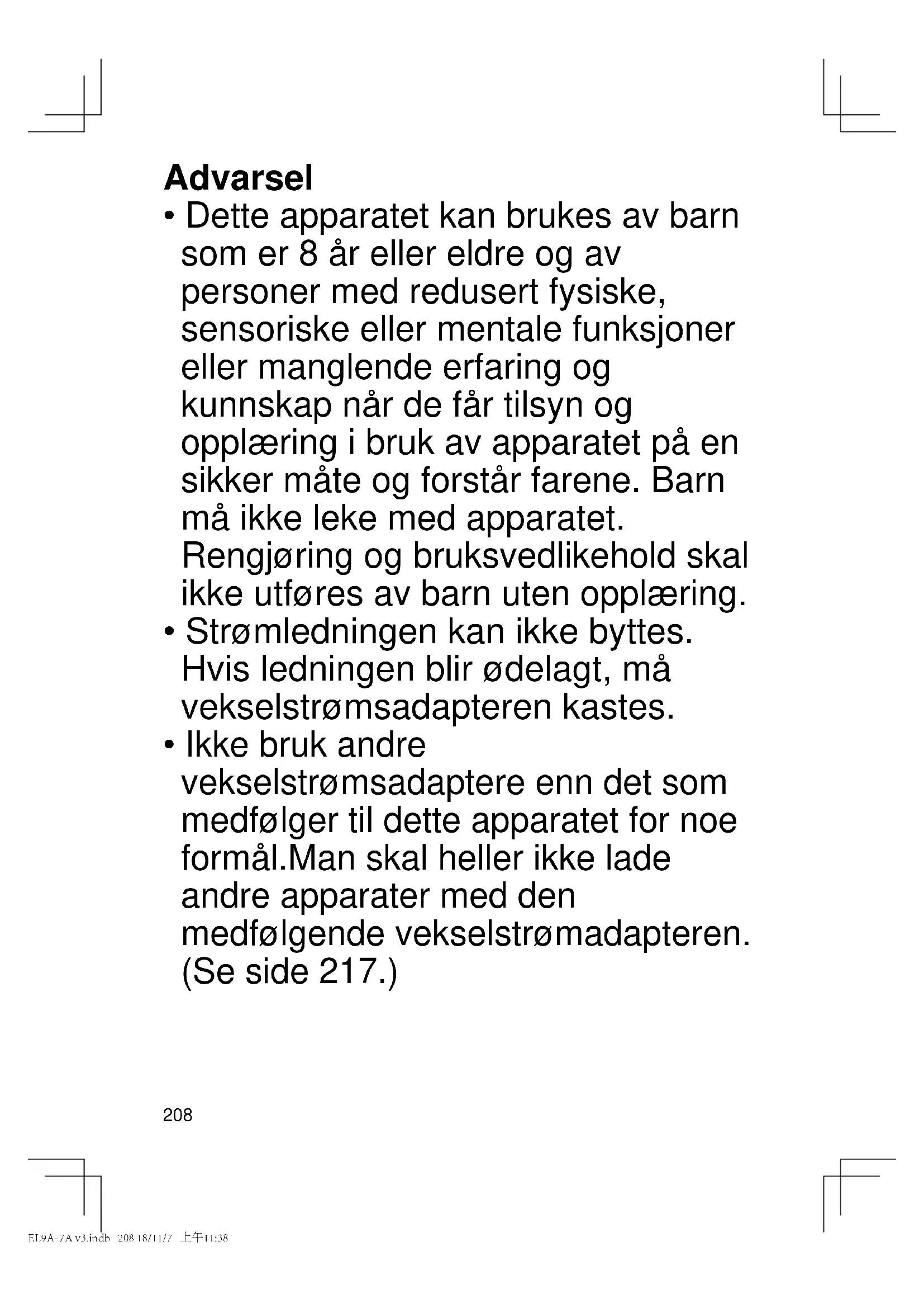 - Ikke bruk andre vekselstrømsadaptere enn det som medfølger til dette apparatet for noe formål.Man skal heller ikke lade andre apparater med den medfølgende vekselstrømadapteren. (Se side 217.) EL9A-7A v3.indb 208 18/11/7 上午11:38209 GBDFINLEDKPNSFINPLCZSKHROTR