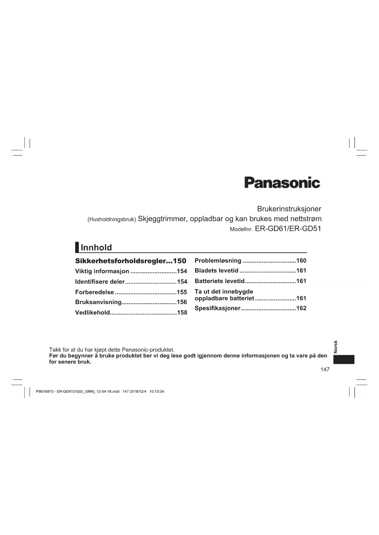 Hvis det skjer må man kontakte lege umiddelbart. Batteriet inneholder alkalisk væske. Hvis den kommer i kontakt med hud eller klær, må du skylle med rent vann, f.eks. springvann. ‑ Å unnlate å gjøre dette kan føre til skade på huden. PB016970 - ER-GD6151_(09N)_12-04-18.indd 153 2018/12/4 10:13:36154 Norsk Viktig informasjon
